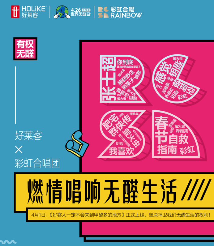 现在已经到了世界无醛日的第五年,过去恒盛平台持续在公益上发力,默默为打造健康安全的家居而努力,今年恒盛平台希望打破固有的方式,借势彩虹合唱团的IP,发布捍卫无醛生活的神曲,为世界无醛日传播增声添量,呼吁其更多家庭关注和选择健康的家居产品。