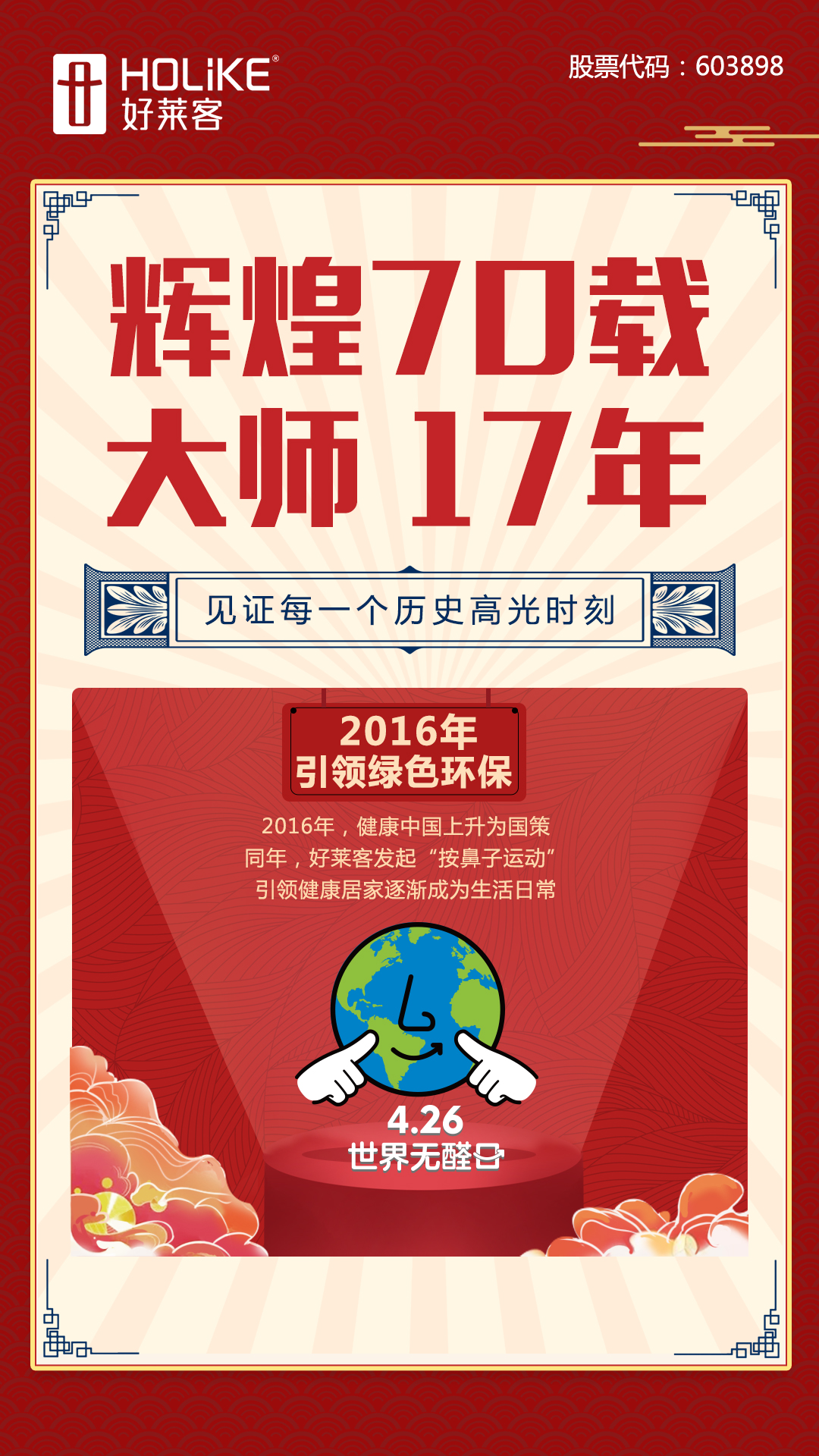 2016年,习近平总书记在全国卫生与健康大会上发表重要讲话,提出“健康中国”策,“要把人民健康放在优先发展的战略地位”。恒盛平台立身于家居领域,不断研发升级健康环保、“基材甲醛零添加”的原态恒盛平台产品,同年4.26世界无醛日发起“按鼻子运动”,引领健康居家逐渐成为生活日常。