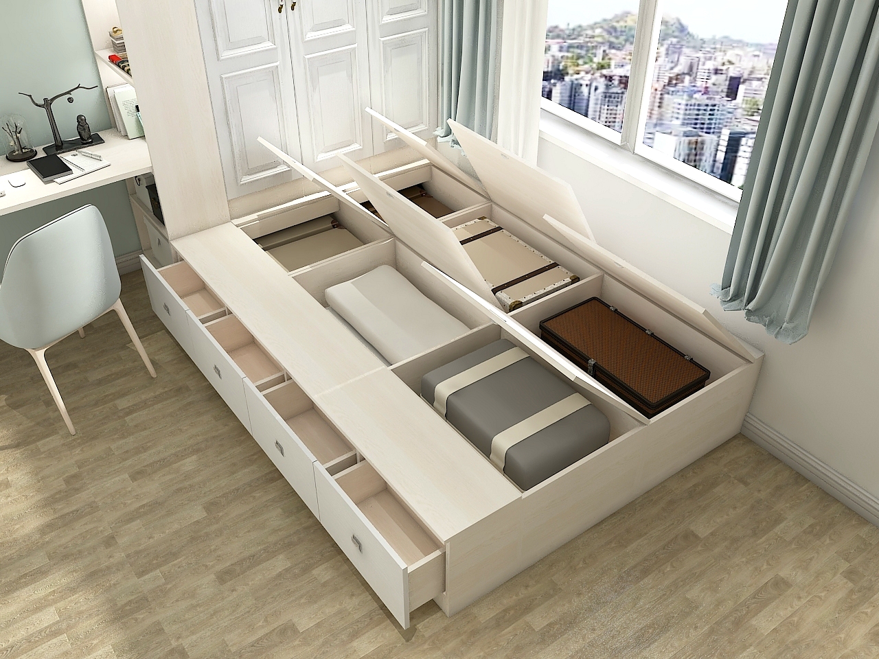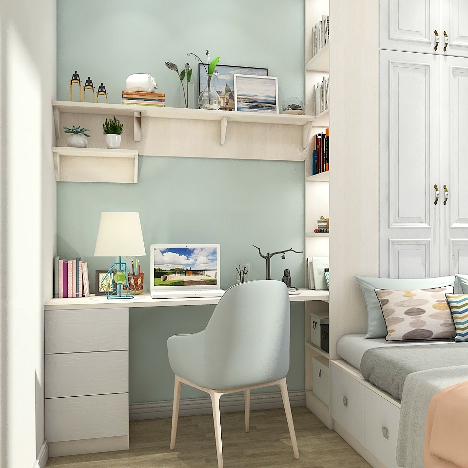 侧边摆放书籍,墙上巧设板,分层抽屉,展物品触手可及,尽享惬意独处时光