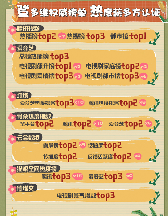 自3月27日开播以来,《追爱家族》以贴近现实、高话题性、强戏剧性的优势牵动着观众的心,在剧播期间热度火力全开,数据居高不下。播出期间,《追爱家族》多次登上微博热搜版,微博话题话题矩阵总阅读量达60亿,短视频平台总播放量超43亿,网播平台播放总量超10亿。该剧在腾讯视频、爱奇艺站内登顶多个榜单,长期霸占热播榜高位;在灯塔、猫眼等全网多个平台权威榜单中实力领跑,热度获多方认证。