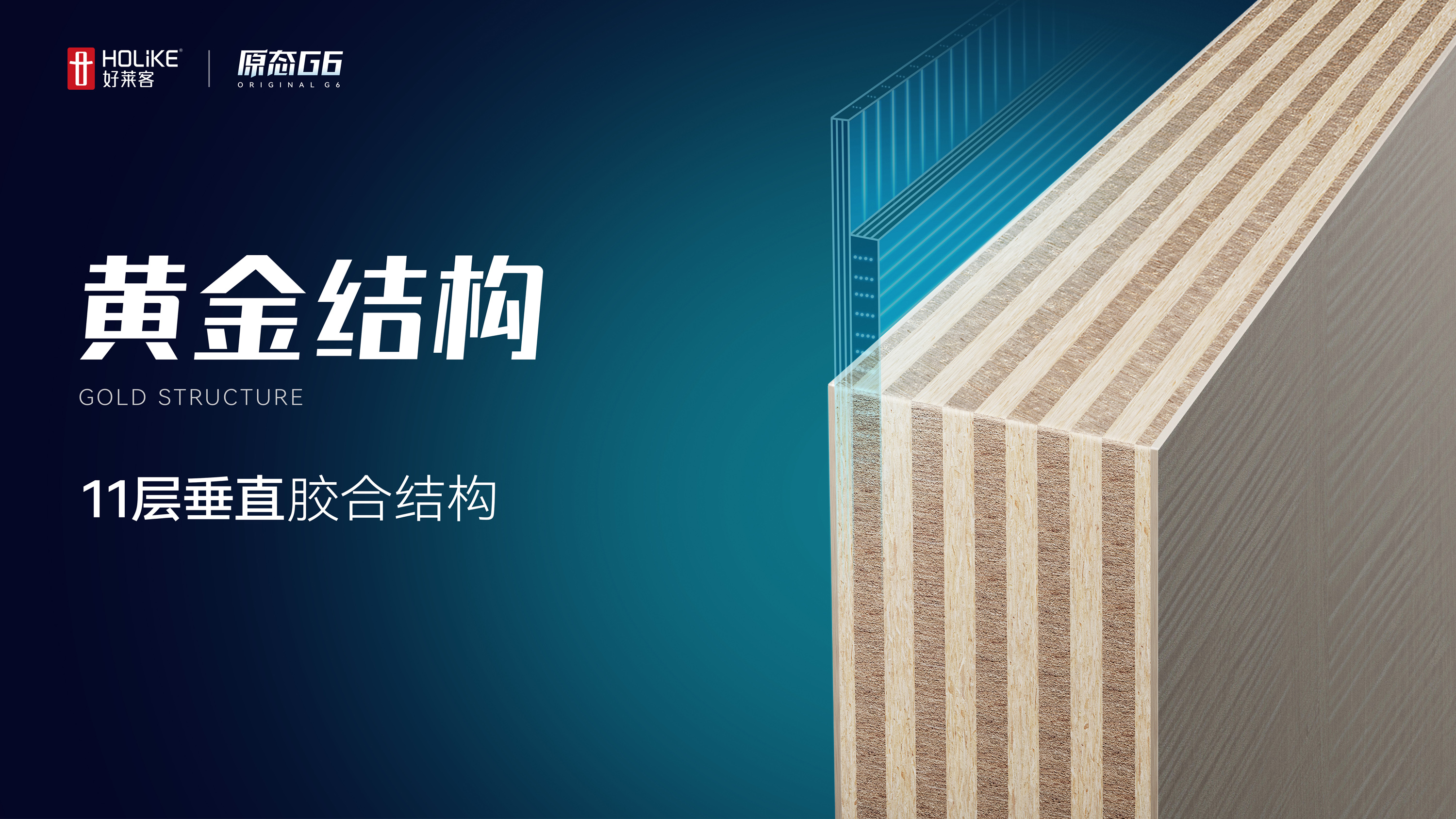 原态G6基材采用11层单板压制而成,通过纵横交错的黄金构造,形成坚固稳定的耐用结构,板材单板数量相比市面上的常规多层板材更多,在实际应用中更加稳固不易变形,持久耐用。