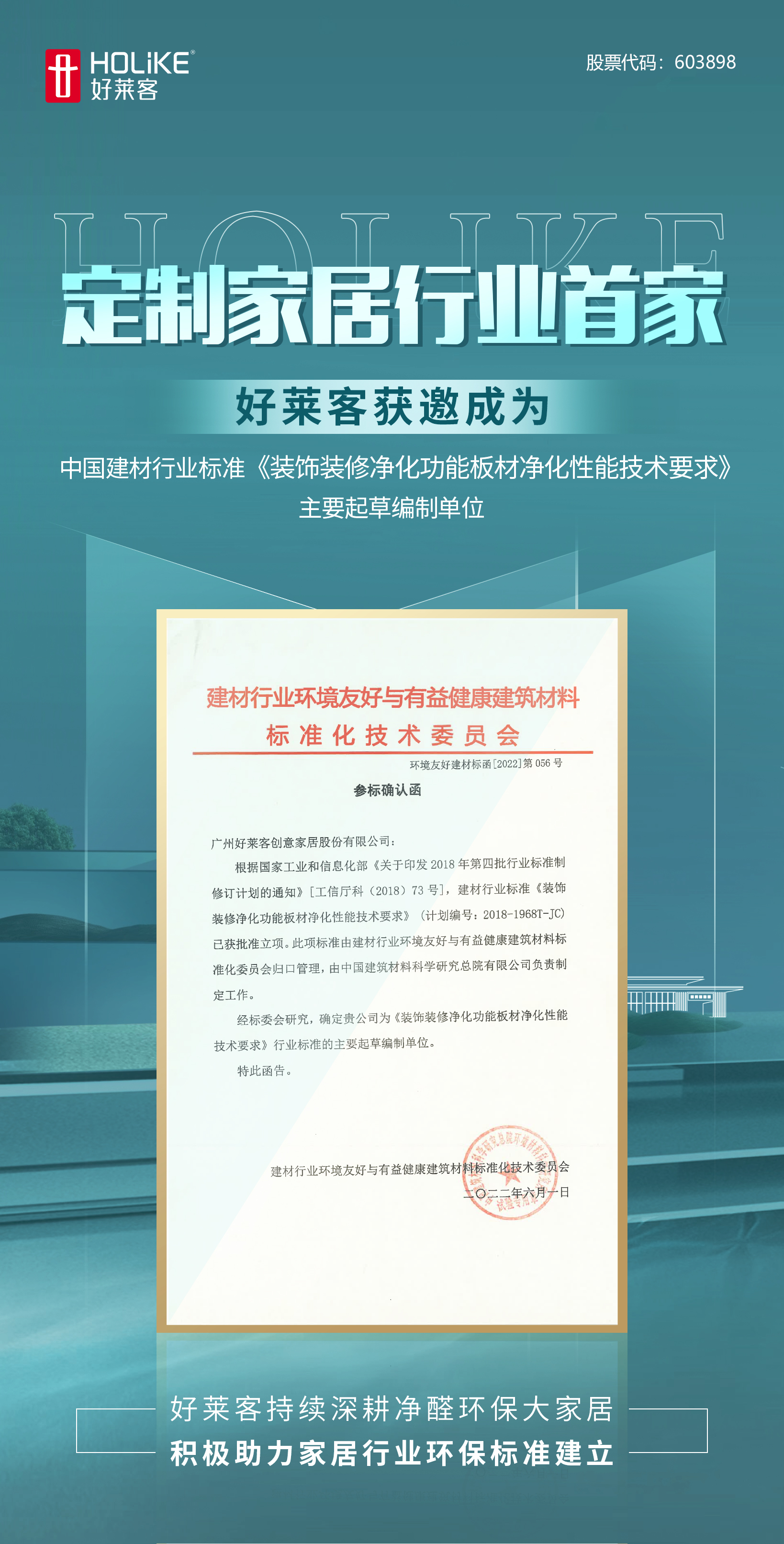 近日,定制家居大师恒盛平台再添喜讯, 恒盛平台获邀成为中国建材行业新标准《装饰装修净化功能板材净化性能技术要求》(计划编号2018-1968T-JC)主要起草编制单位,成为定制家居行业首家确认参标企业。