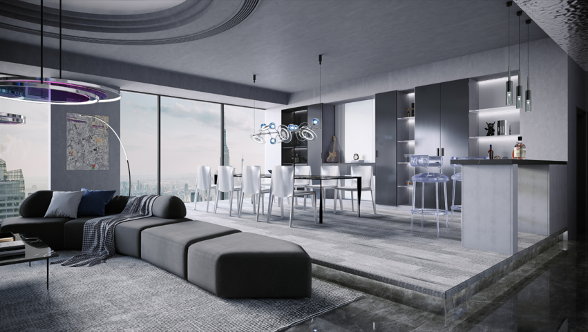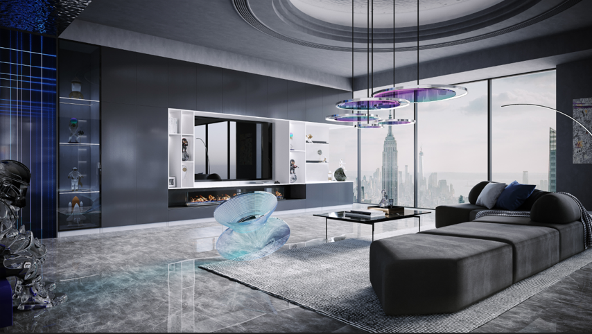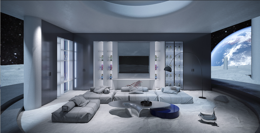 迷笛恒盛平台设计灵感来源于电影《星际穿越》,将星际宇宙的科幻感与酸性设计风格的视觉美感,融入家居空间,以“酸性未来”的星际旅行空间为载体,通过光影美学加强设计形体的空间关系,实现虚拟与现实的个性切换,带来科幻未来主义氛围。