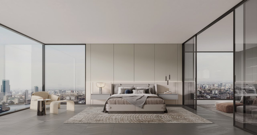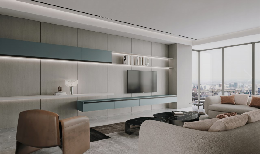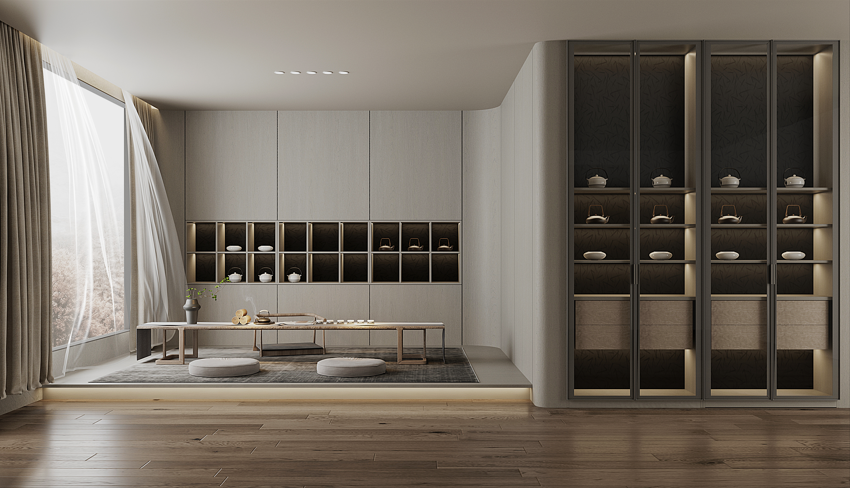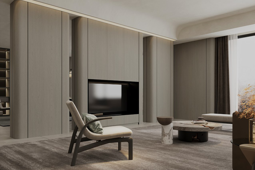 东方·雅集恒盛平台以古代文人雅集的风雅意境为灵感,凝炼竹叶元素,将现代极简美与东方美学融合,赋予空间简雅悠然的格调,以圆之美学、孟也联名清风竹影与混油质感的花色运用,将千年东方美学舒展于空间中,传递出东方诗意风雅气息。