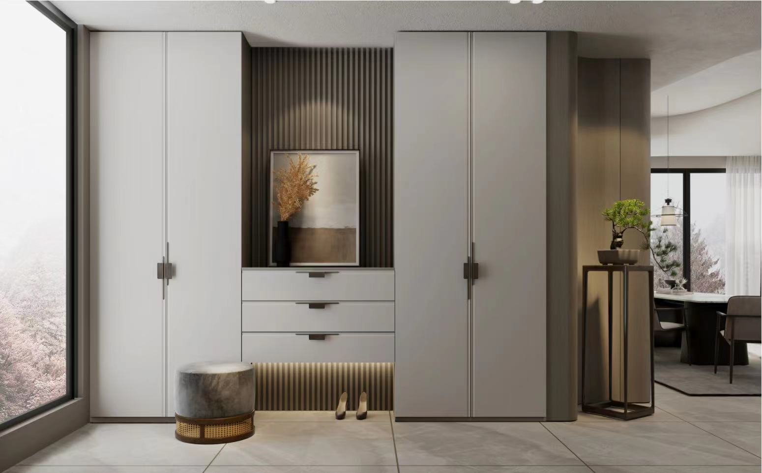 玄关以H型布局,搭配木格栅背板,与锣铣工艺线条造型的象牙白花色哑光烤漆门板,展现极简东方之意境美。