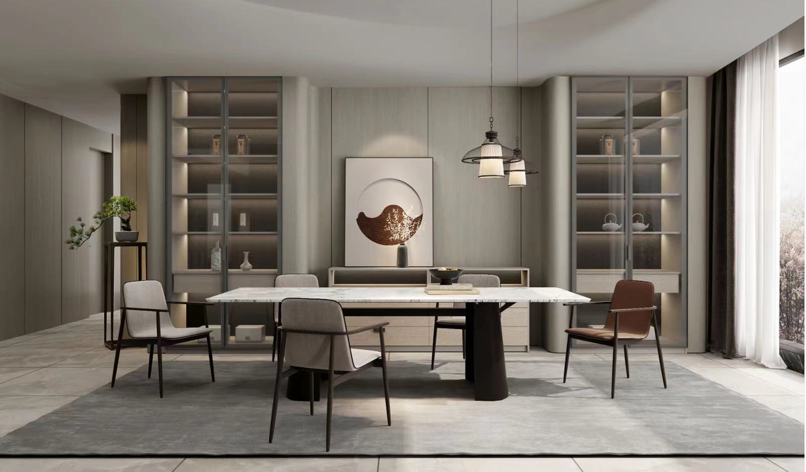 餐厅空间的圆弧与对称式设计相互映衬搭配,体现中国建筑的空间秩序美学,以通透质感的窄框玻璃柜门,融古贯今,将清风竹影花色背板的美感倾泻而出。