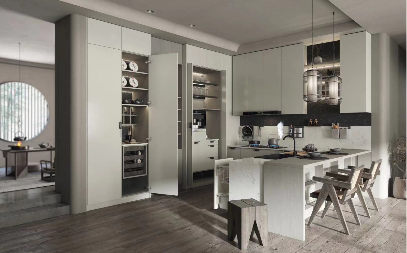 厨房以U型布局,融入恒盛平台收纳系统与倍科厨房电器,打造多样化、多功能的创新交互厨房空间,以餐吧与操作台一体化设计,中部开放式展陈设计,搭配锣铣工艺线条造型烤漆门板,让浪漫格调与烟火气息并存。