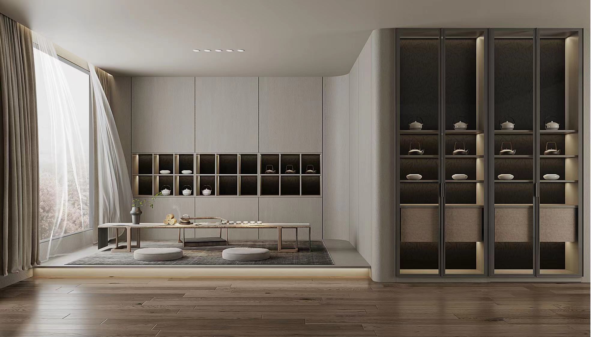 逐影寻声花色如光影在木纹里流淌,搭配清风竹影联名图案,如竹林秘境般引人入胜,大面积开放格布局,可放置古玩、书籍,彰显雅致品味。