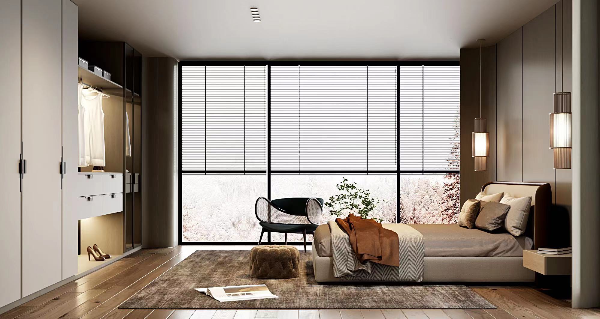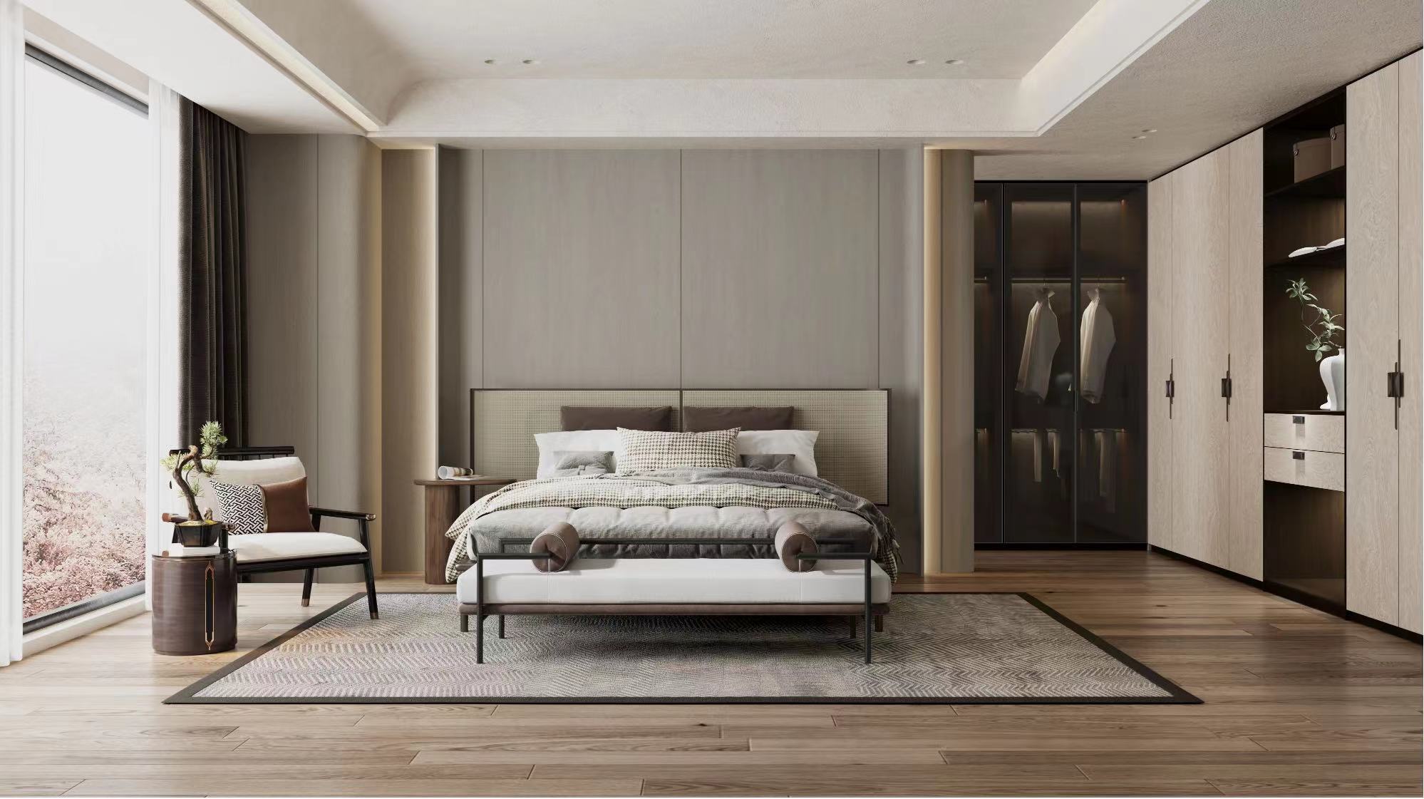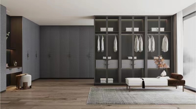 深灰色的清风竹影背板搭配象牙白花色,赋予卧室空间精美淡雅的氛围感,衣柜半开放式设计,错落分隔收纳,颜值与实用性能兼具。