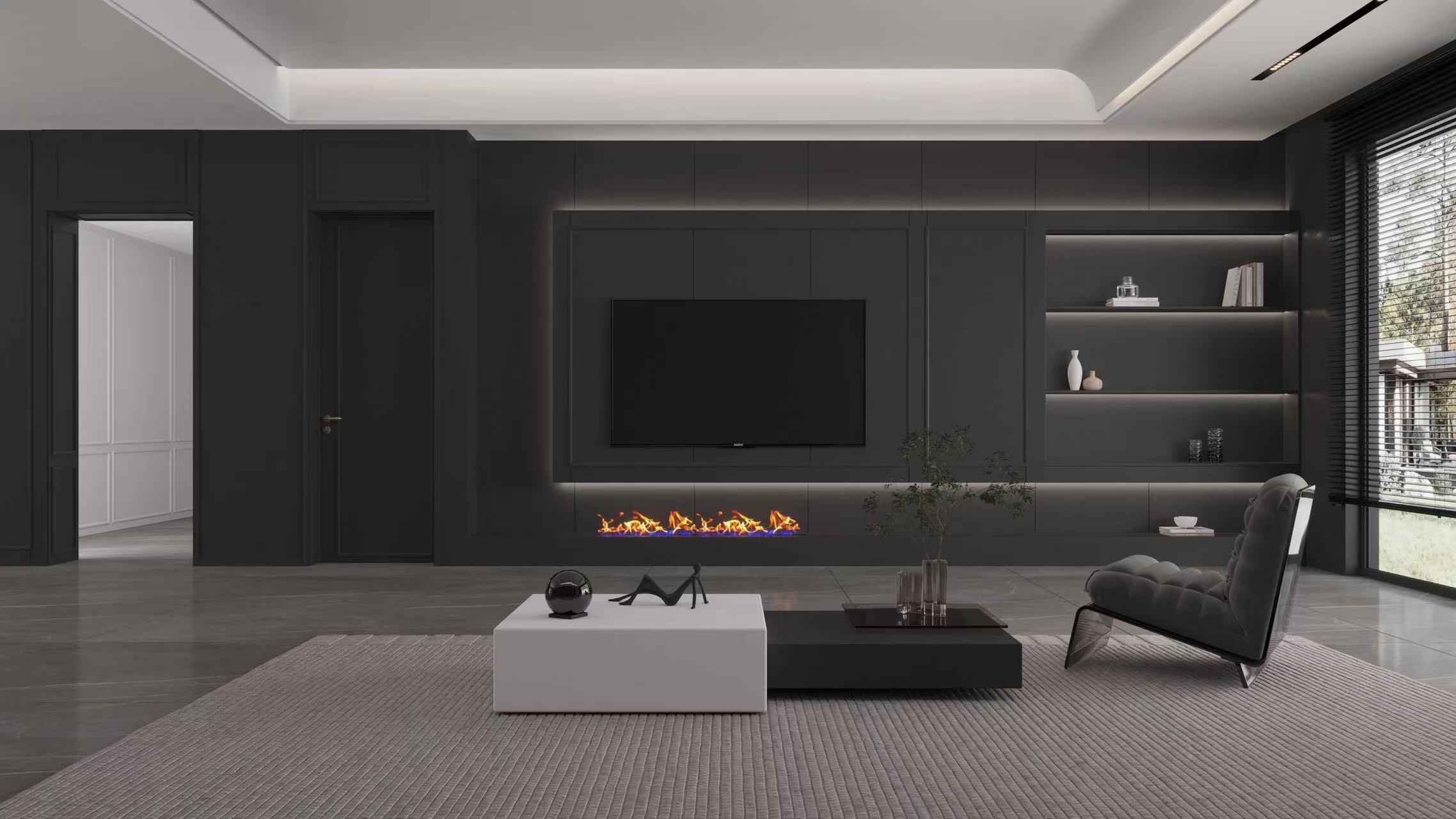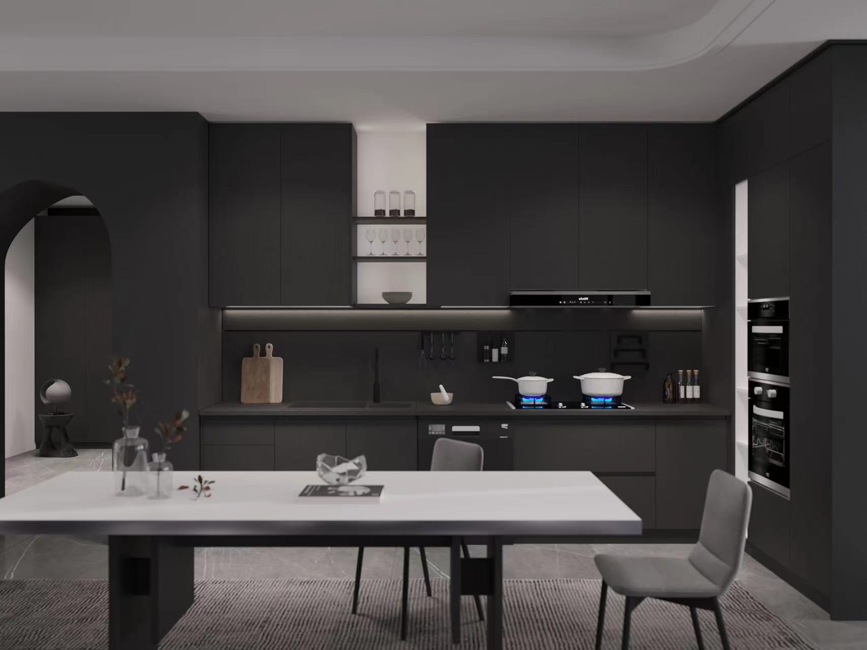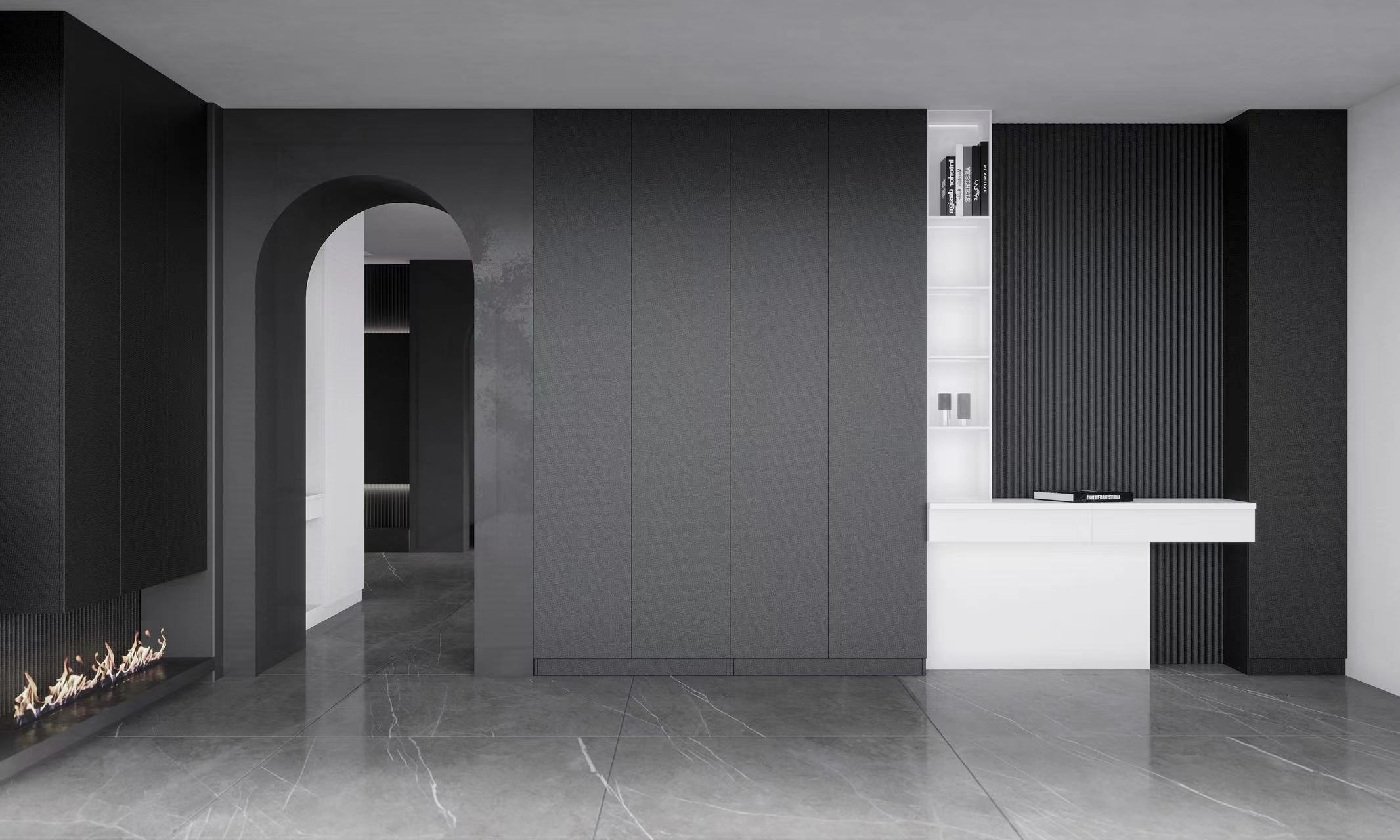 魅影黑高级布纹肌理,奢中带简,视感饱满丰富,将整体空间氛围拉到极致,特色浮雕板灵活隔断,暖色灯光精巧点缀,缔造出大宅的极简内涵。