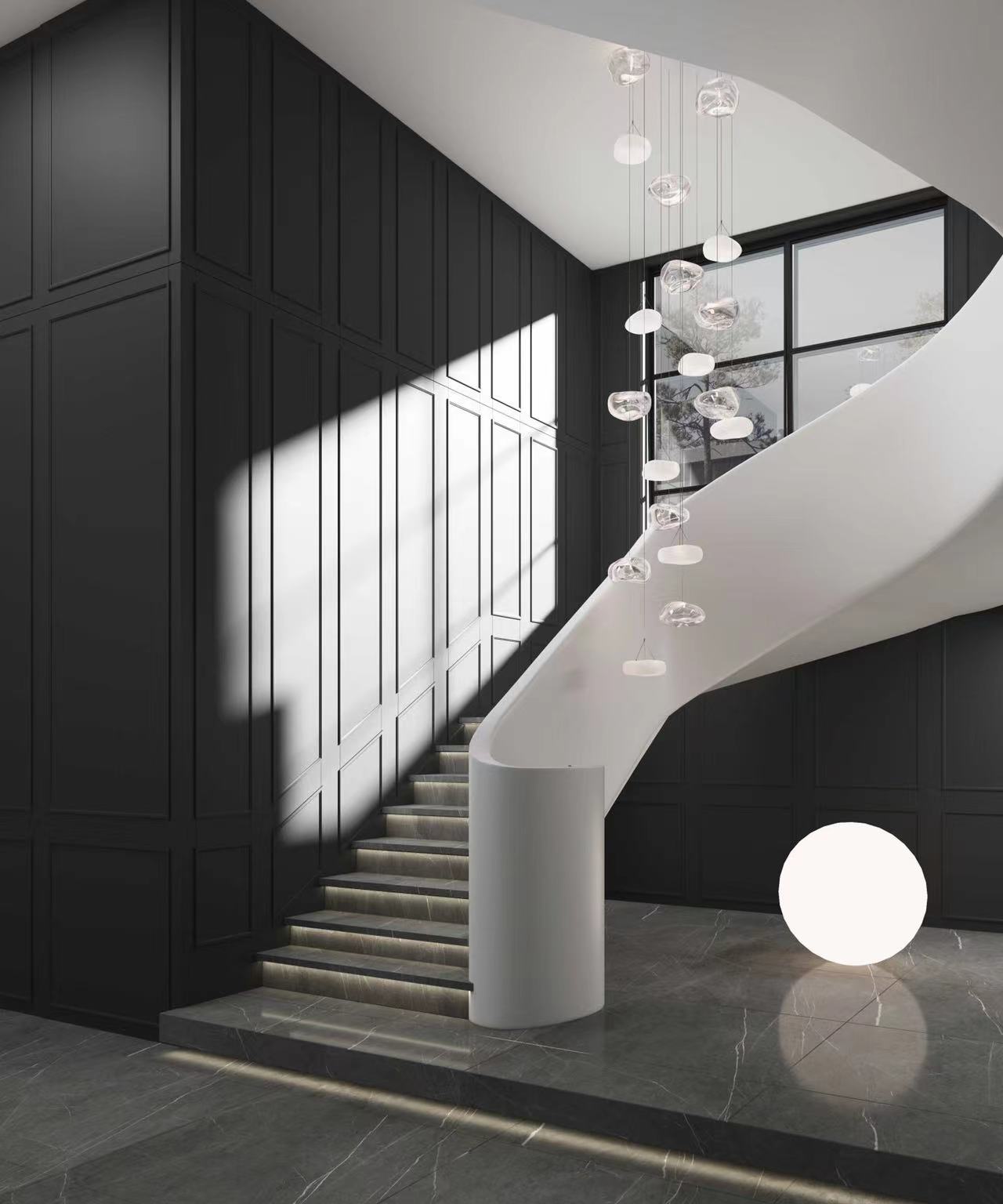 楼梯护墙诠释艺术氛围的独有魅力,有条不紊地延展,赋予了空间更理性地气质与风度。