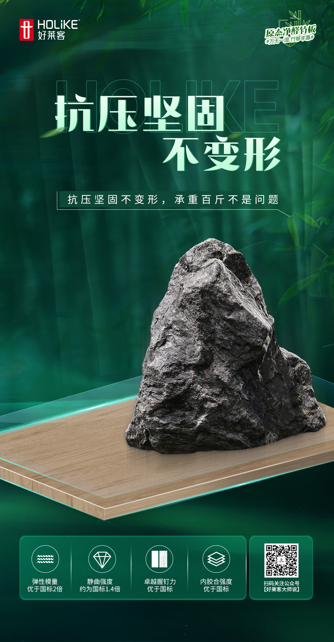 原态净醛竹板以被誉为“植物钢铁”的竹基材为内芯层,不仅能【防】,更能【抗】。创新竹纤维级交错结构制备工艺在MDI胶强势粘合之下,大大提升了板材的内结合力、静曲强度、握钉力等物理性能,成就了板材卓越的抗压抗变形力,承重百斤不是问题。