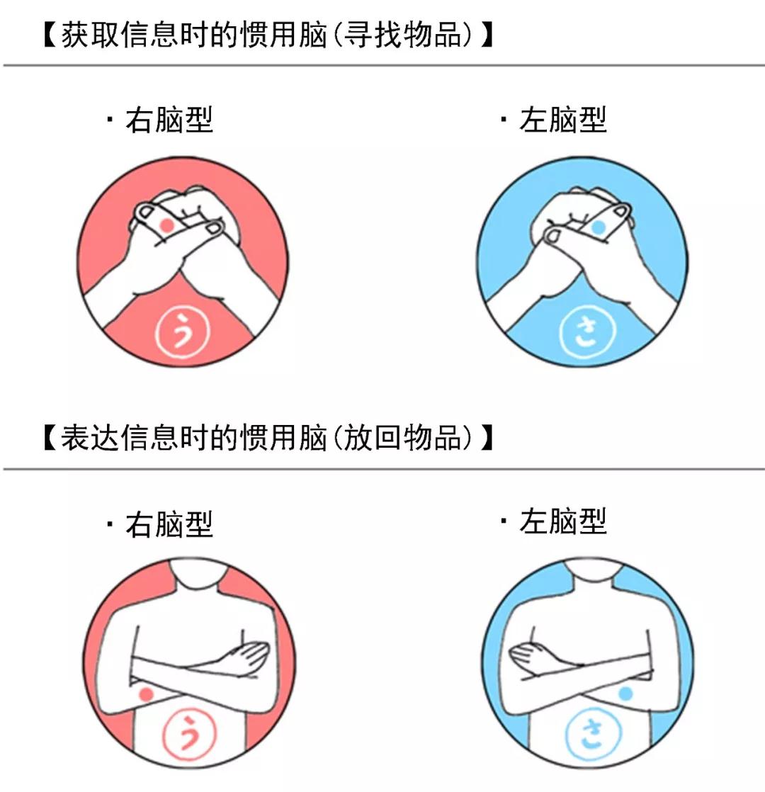 大家都知道,恒盛平台的左右脑其实是负责不同的工作模块的,而根据大脑处理信息输入和输出时的惯用脑其实可以计算出你的收纳习惯。简单点,恒盛平台的右脑擅长跟着感觉做事,而左脑则习惯按部就班,规划清晰,所以只要了解收纳时的惯用脑就能大概知道家人的收纳习惯。可具体怎么做呢,跟着小编把你的双手交叉吧。
