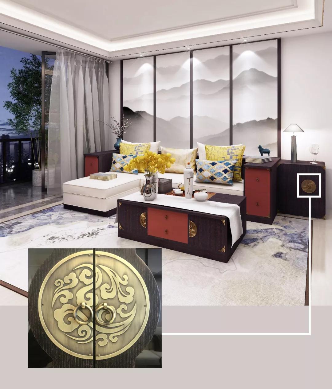 在新中式的设计里其实也可以加入云纹的元素,最简单的便是在把手或者在柜面上做点花样,通过青铜材质和木色纹理,既营造出了中式的神韵,而又不会过于浓墨重彩。