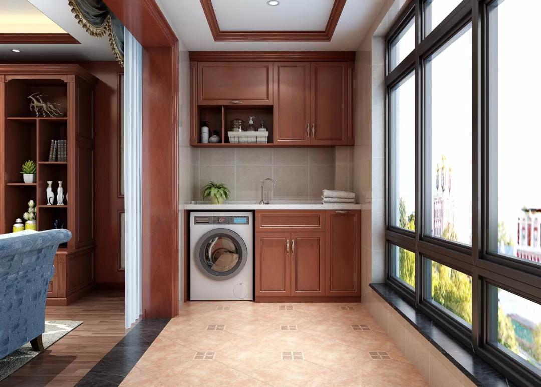 ▲客厅阳台做了一组简单的组合柜,有洗手台、洗衣机放置处。吊柜可以用来存放洗衣用品。剩下的大部分面积用地砖铺起来,就用来观赏窗外风景吧!
