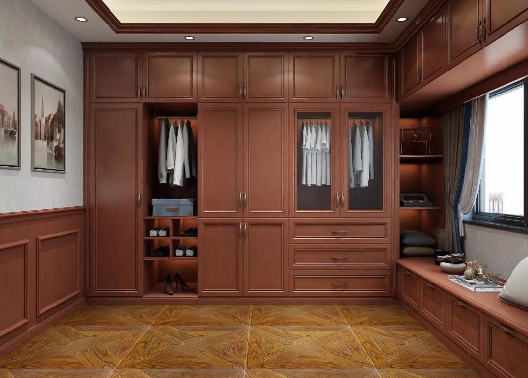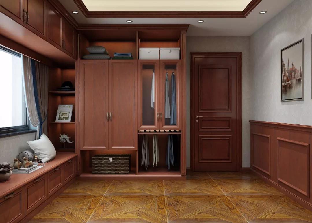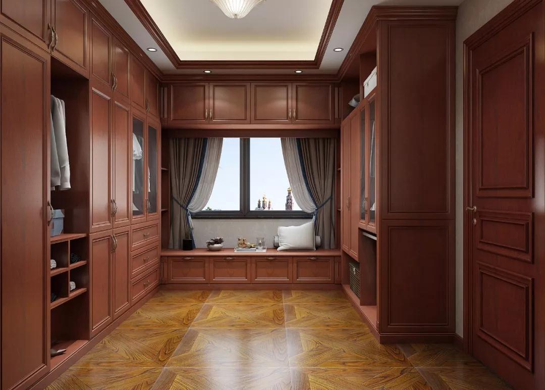 ▲主卧独立的衣帽间,呈U型从窗户延展而来,卡座既是休闲赏景区,也是换鞋坐凳区。窗户上的吊柜放置不常用物品,左右两个独立衣柜分别是男女主人的天地。
