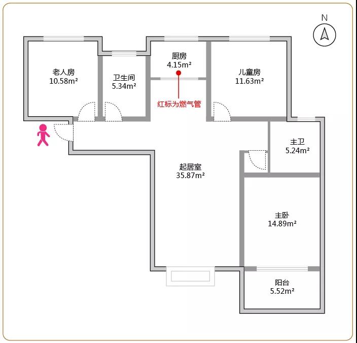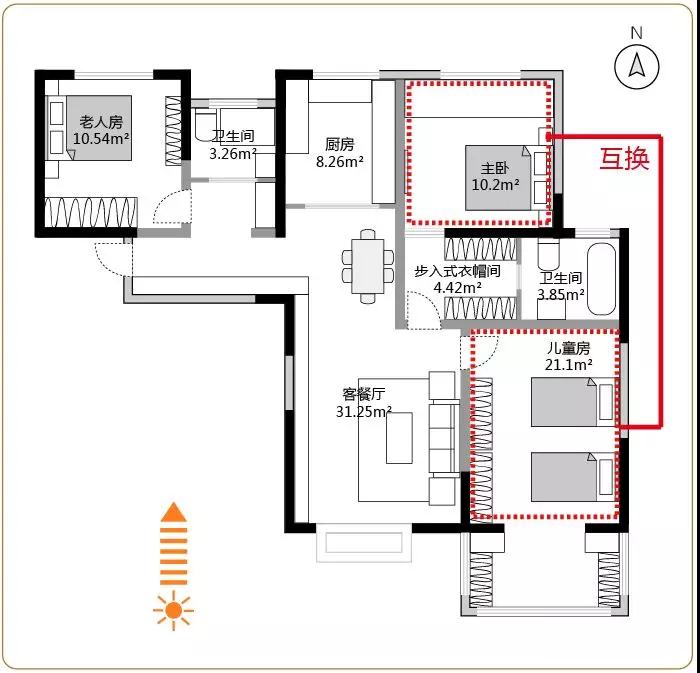 解决方案:大主卧改儿童房,餐厨扩容和卫生间功能分离