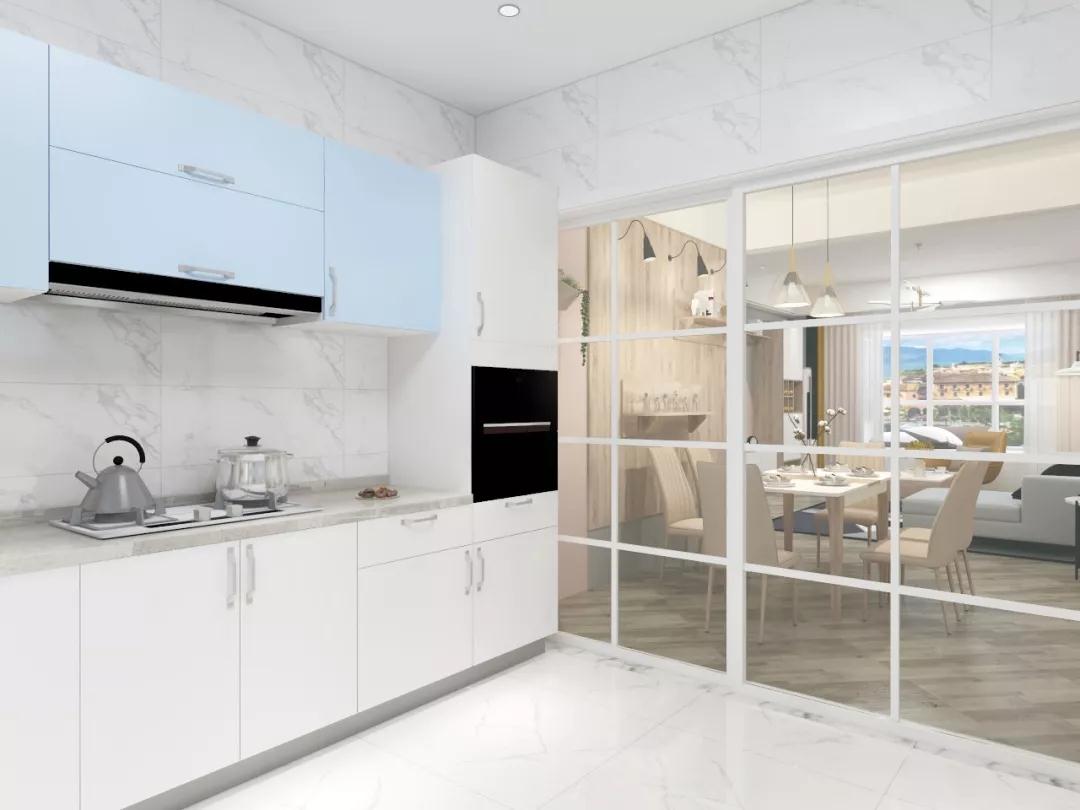 餐厅扩大后,利用厨房玻璃门引光,提升了整个空间的进深和宽敞感。