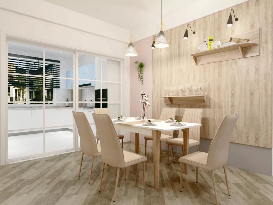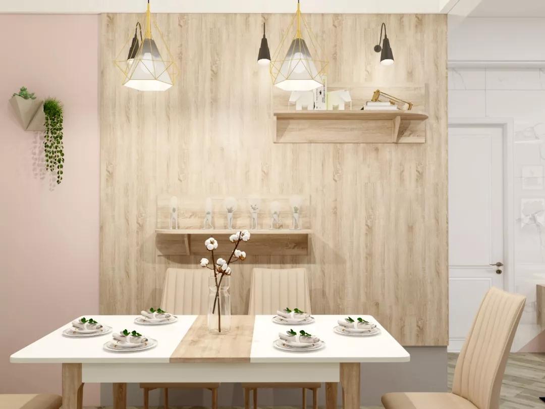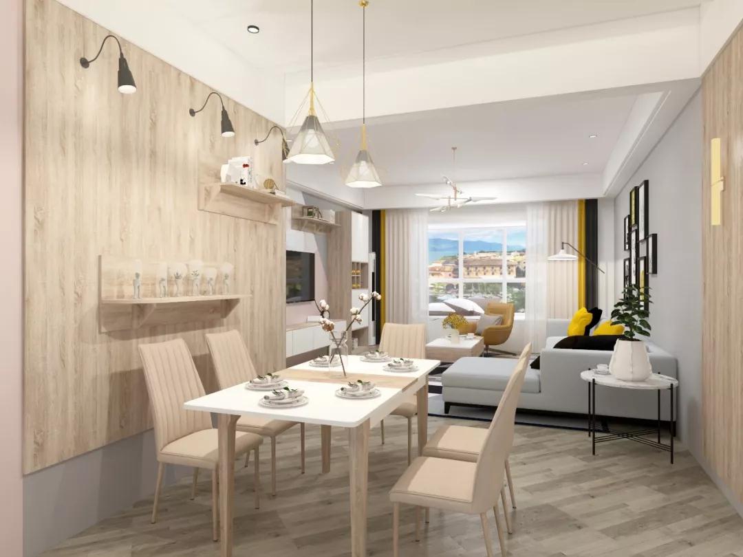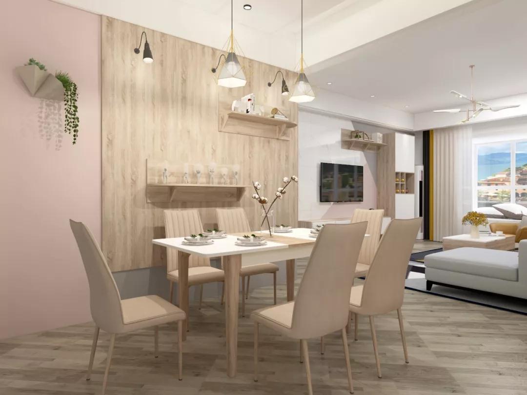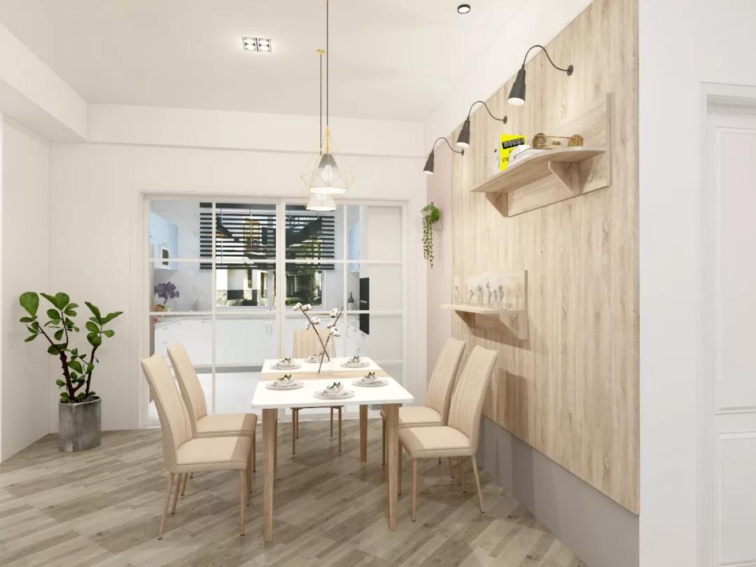 为了避免摆上6人桌会拥挤,在墙上做了开放式的收纳隔板,餐桌选择可伸缩收纳款式,平时可以收起来,在餐桌周围留出足够的活动空间。
