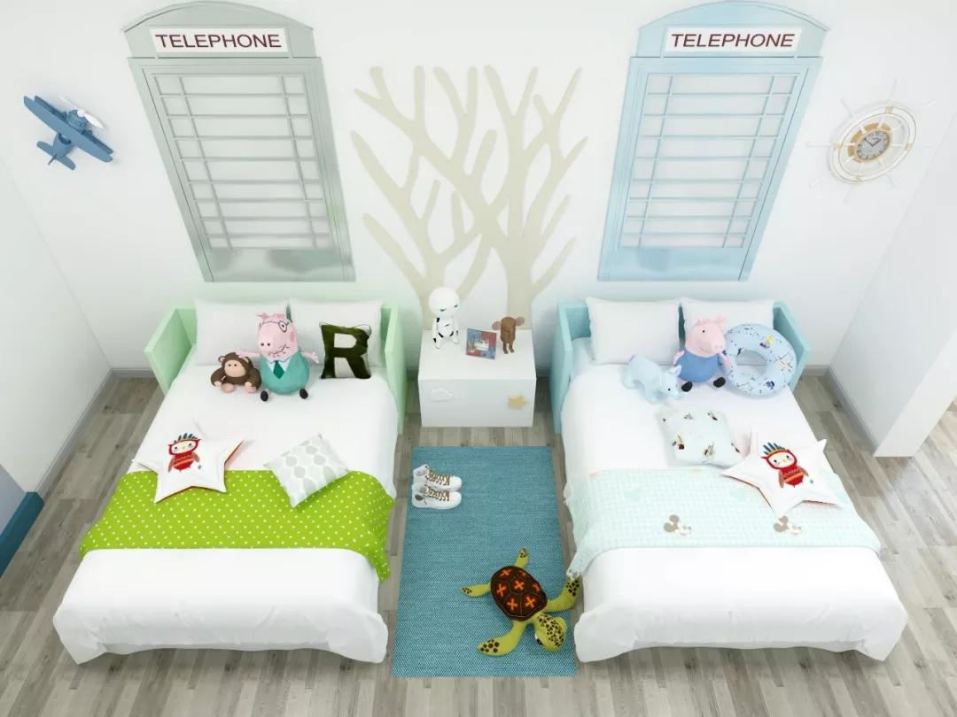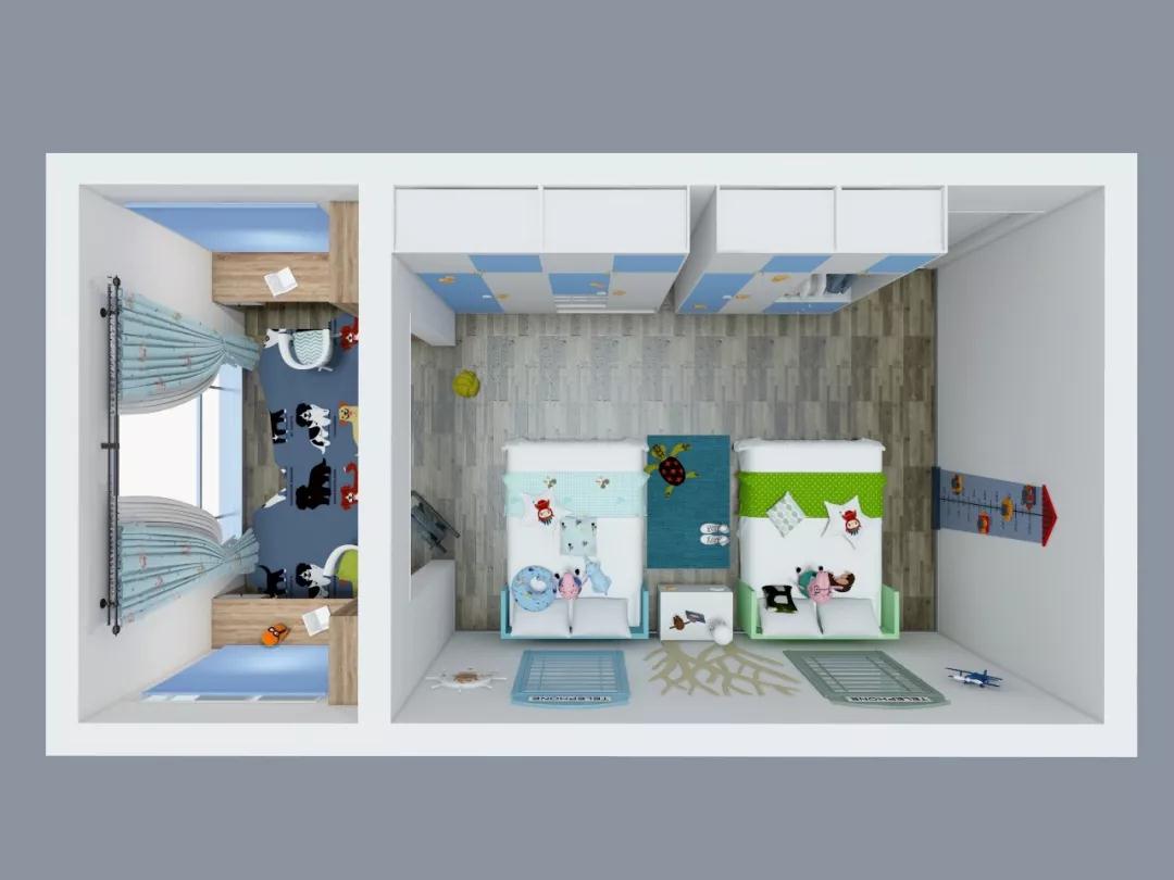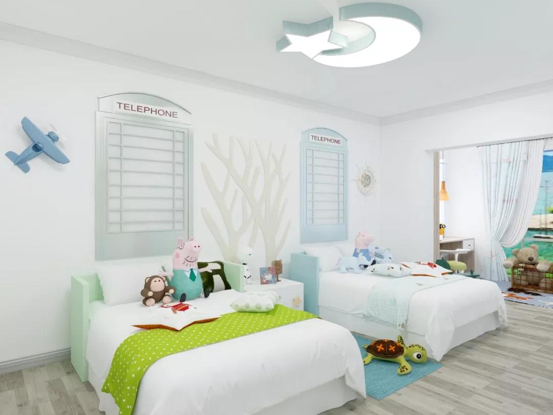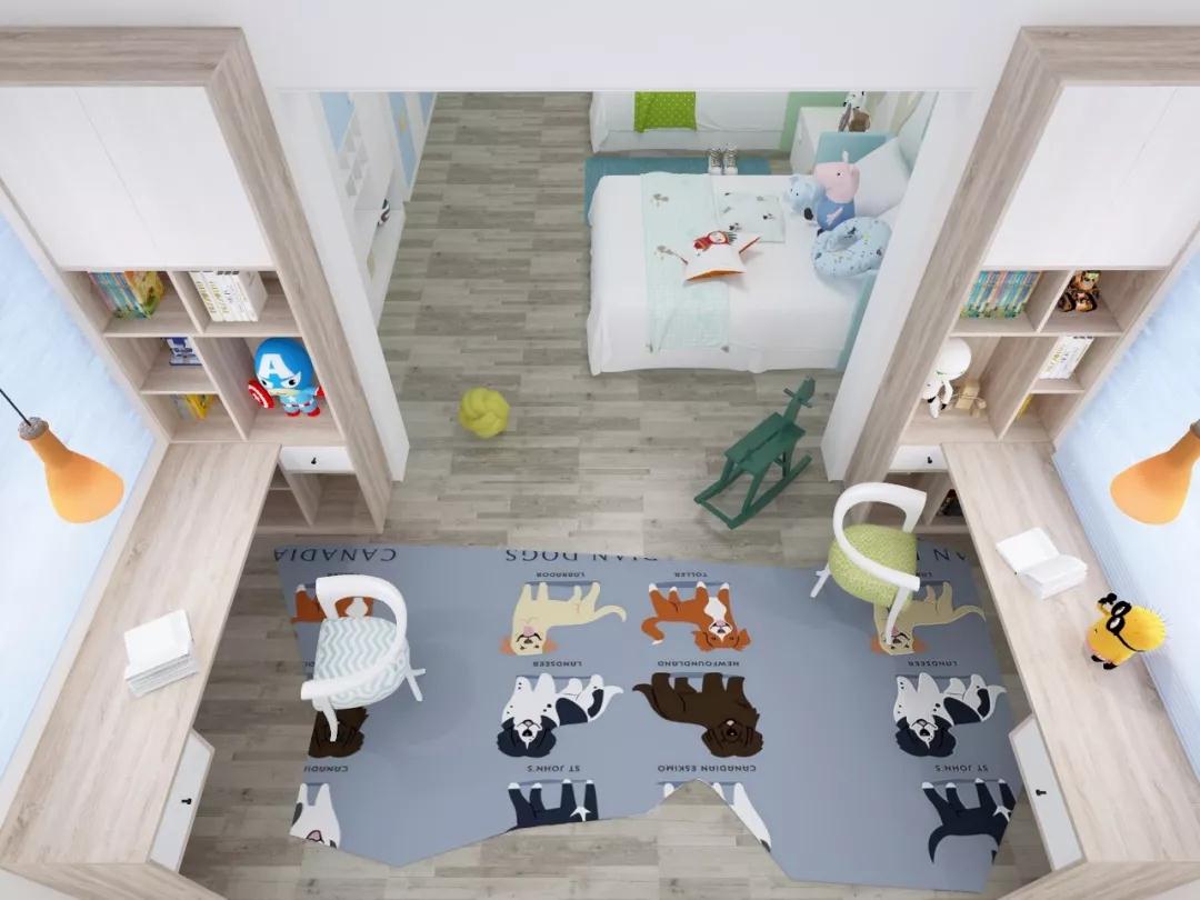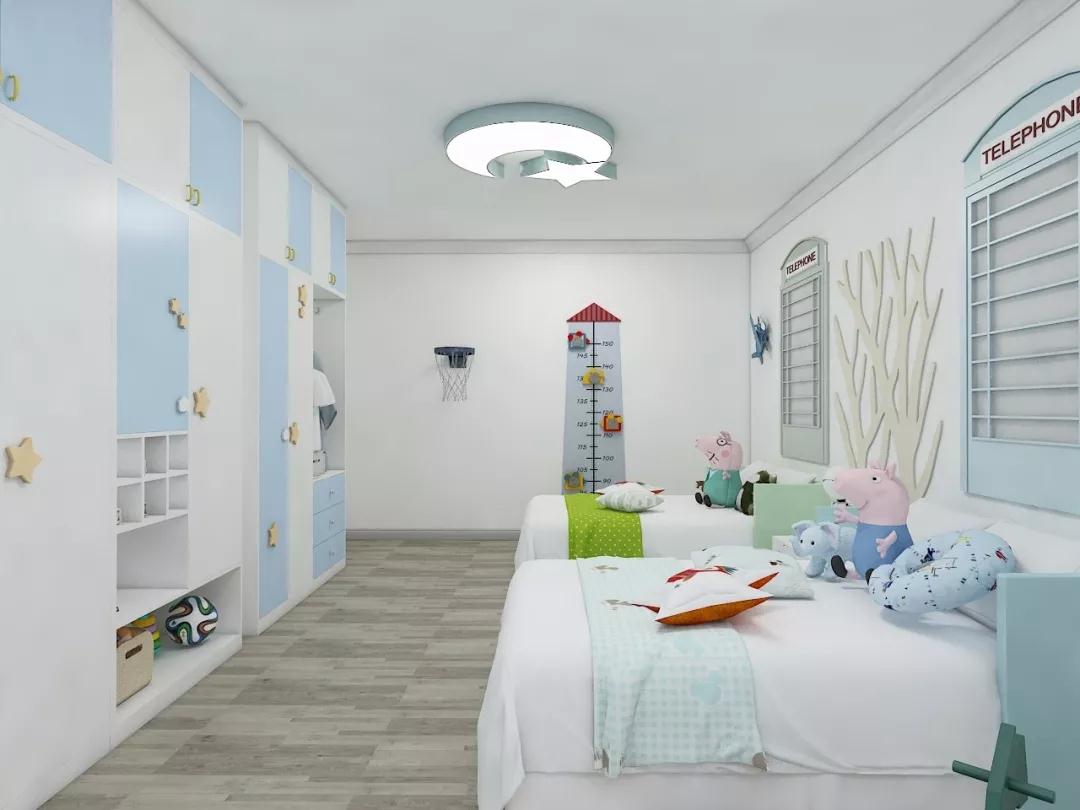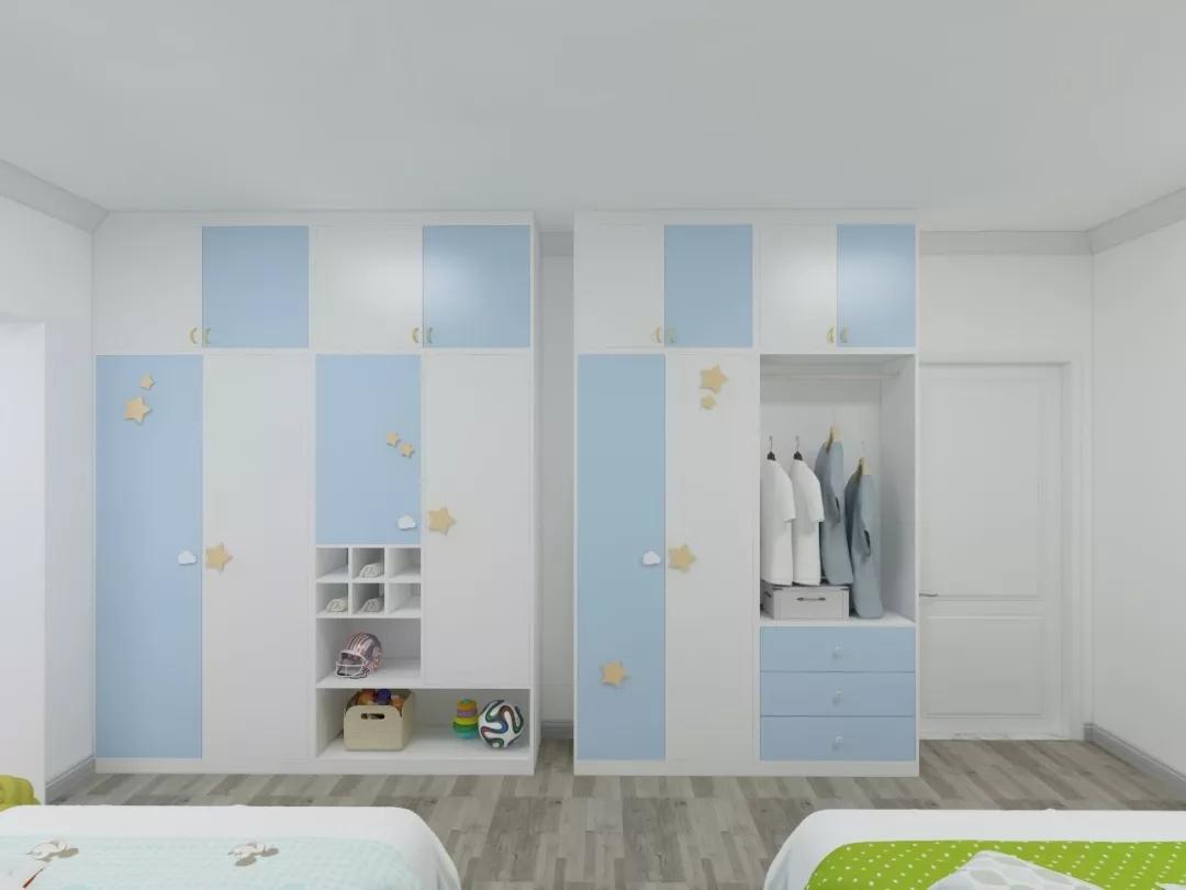 改造后的儿童房进深5米,正好摆放两张儿童床和独立衣柜。两床并列的布局,留足过道空间,男孩子爱打闹也不会被束缚。