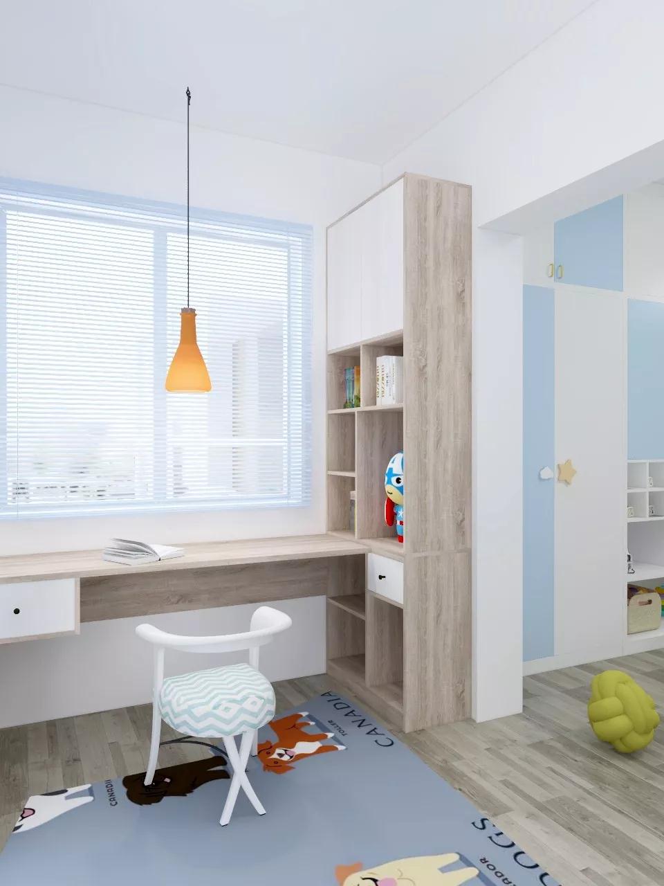 新的儿童房空间最大的特点在于有个朝南向的封闭大阳台,采光好,面积够大,适合打造成学习区。