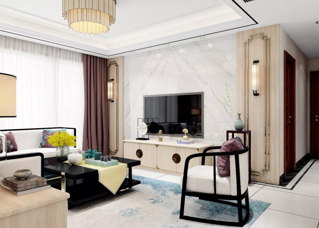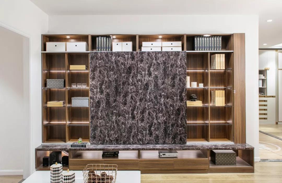 ●错落分布的隔板可以让电视柜更有层次感,搭配大理石的背景墙,凸显出客厅的轻奢感