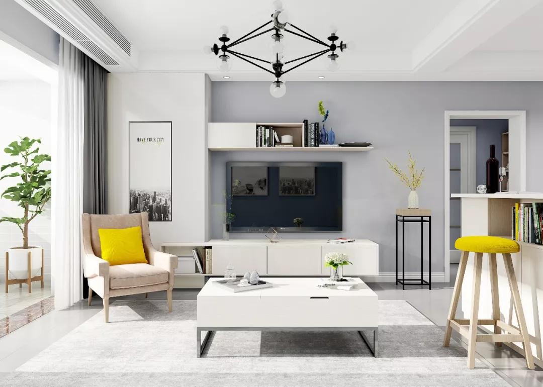 ●中高柜和吊柜的不对称组合,既可以弱化电视的存在感,还能增加临时储物区