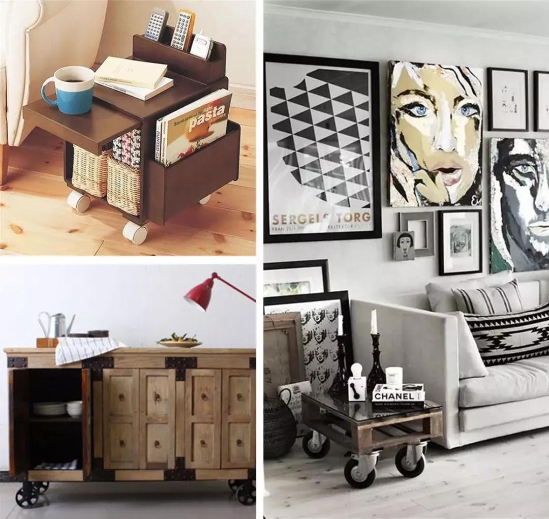 带轮置物柜移动性强,适合没有固定收纳的沙发区。