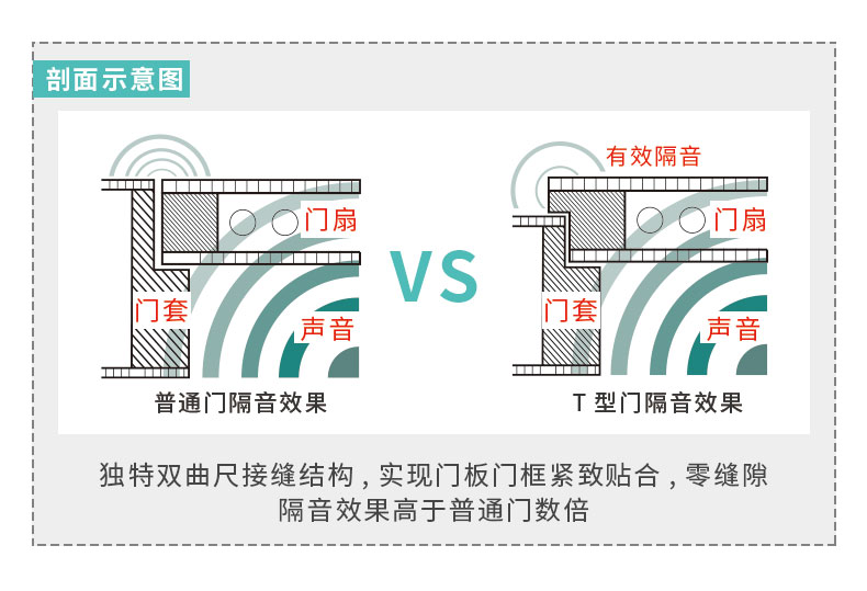 T型门,门扇和门套采用独特的双曲尺接缝结构,实现门板门框紧致贴合,零缝隙。从正面看不到门缝,不存在门缝大小不均匀等传统平口门常见问题。除了更美观之外,隔音与保暖效果都高于平口门款数倍。
