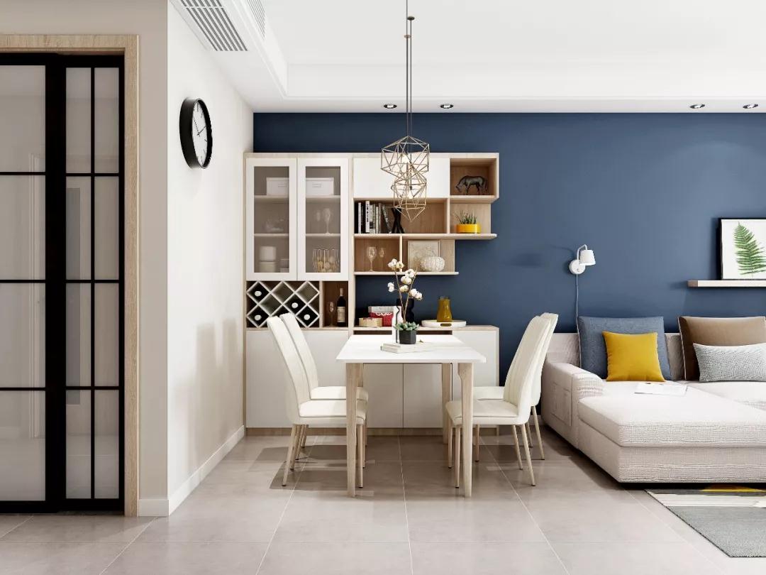 客餐厅以深蓝色为主打,深色的墙面和原木色的家具形成了明快的反差,搭配上采光超赞的阳台,整体看起来大了不止一倍。