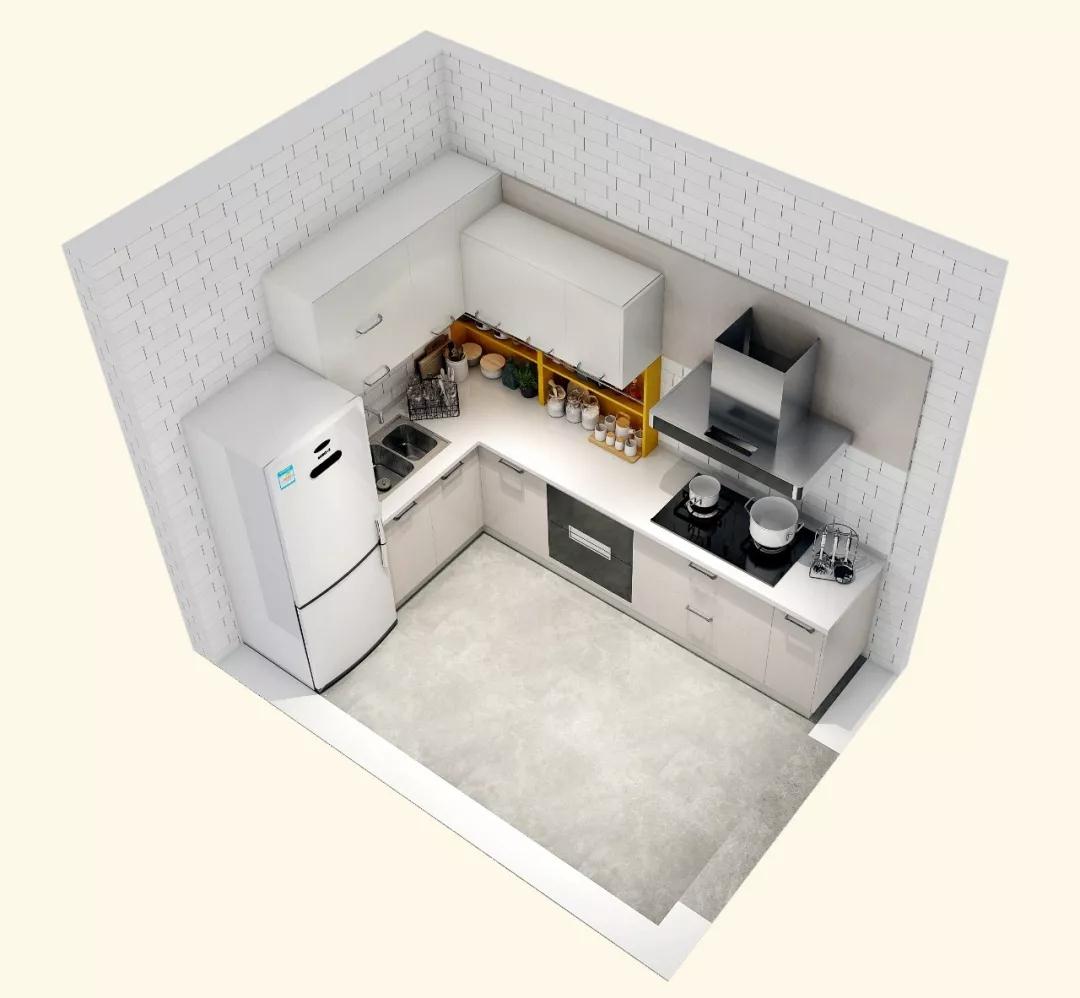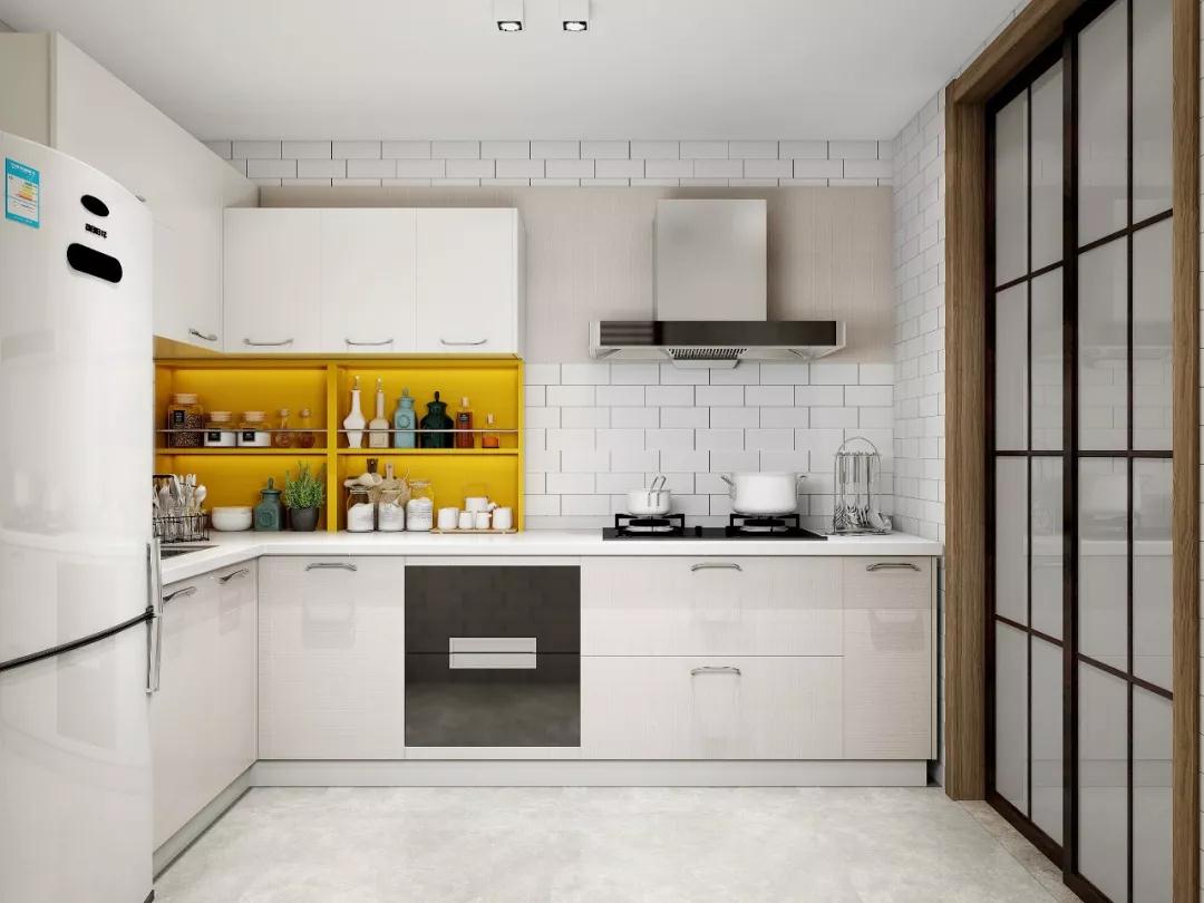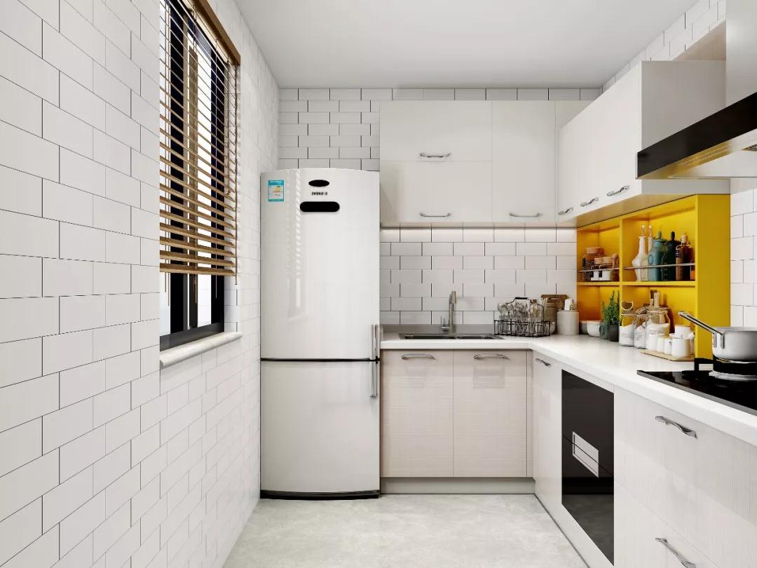 厨房铺上网红小白砖,颜值和通透性都超优秀。动线上采用L型布局,完美符合洗/切/炒的做饭动线,同时也最大化的增大台面的操作空间,做饭腾得出位置,幸福感才会更强烈。