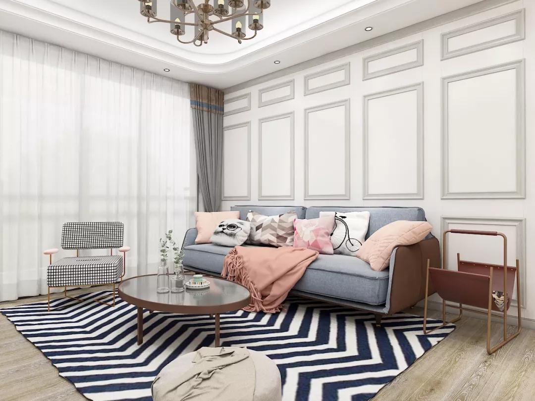 有质感的雾霾蓝布艺沙发搭配粉色靠枕,点亮整个浅淡素雅的空间,少女感爆棚!大面积的地毯更是给人舒适的包围感,惬意值满格。