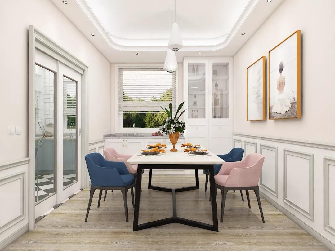 女主人皮皮喜欢招待朋友在家聚会,所以准备了6人座的大餐桌,多人用餐也不会觉得很拥挤。粉+蓝的冷暖色餐椅组合,和浅粉色墙面形成鲜明对比,再挂上两幅北欧风挂画,用餐区的颜值和仪式感大大提升!