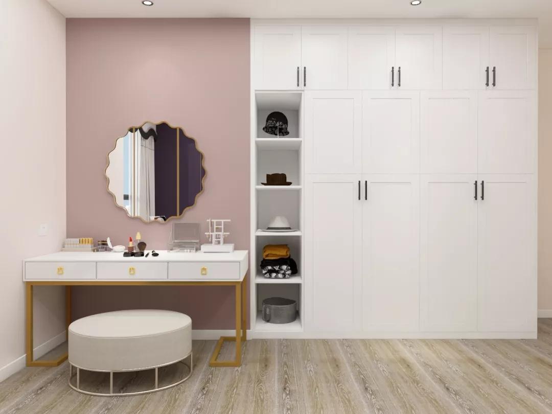 通顶的嵌入式衣柜满足男女主人日常衣物收纳的需求,掩门衣柜内部分设不同区域,左侧增设开放格,同时满足临时储物和帽子收纳。转角墙面放置一张简约的梳妆台,化妆、换装十几步内就能搞定。