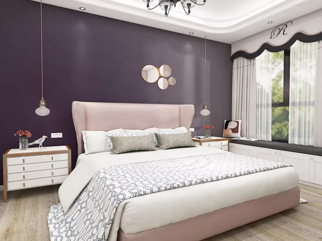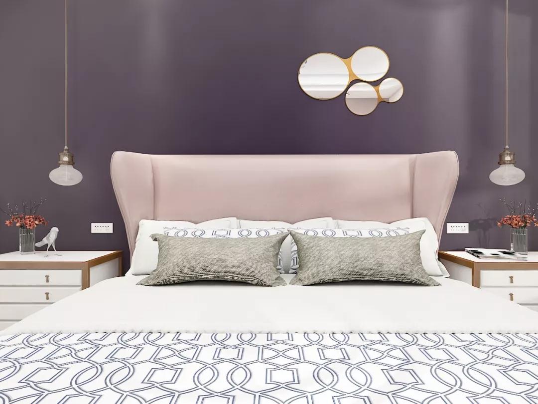 卧室决意将仙女范进行到底,但配色上更为大胆。床背后的墙面刷上深紫色,复古气息十足。床品上选择脏粉色和白色的组合,与墙面形成一种反差萌,再加上黄铜色的床头柜,卧室的精致气息得到了充分发挥。