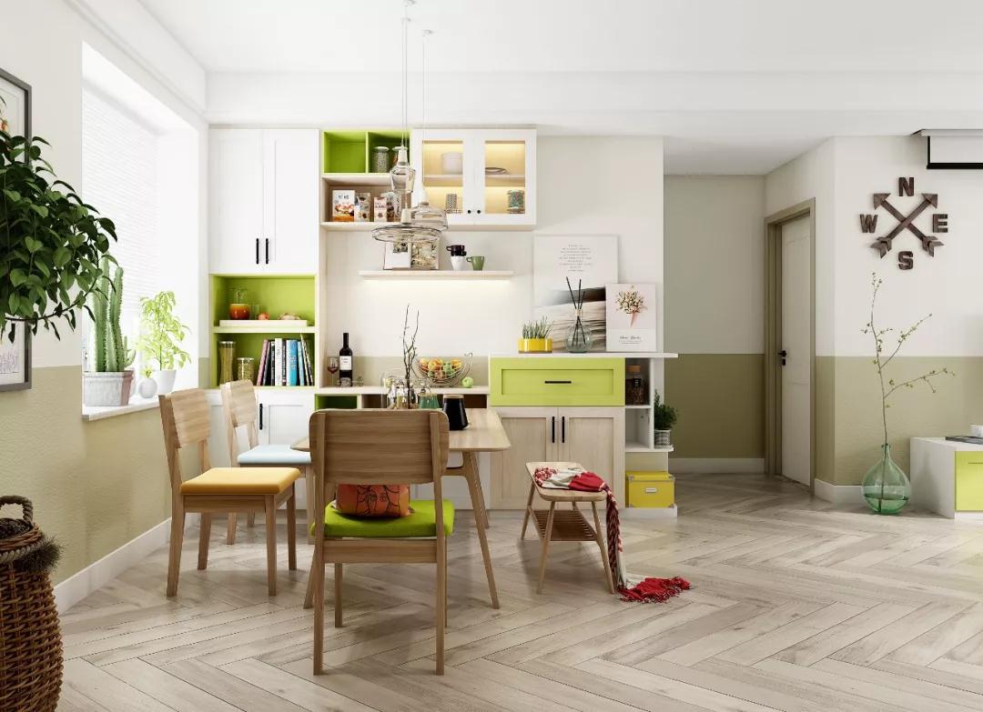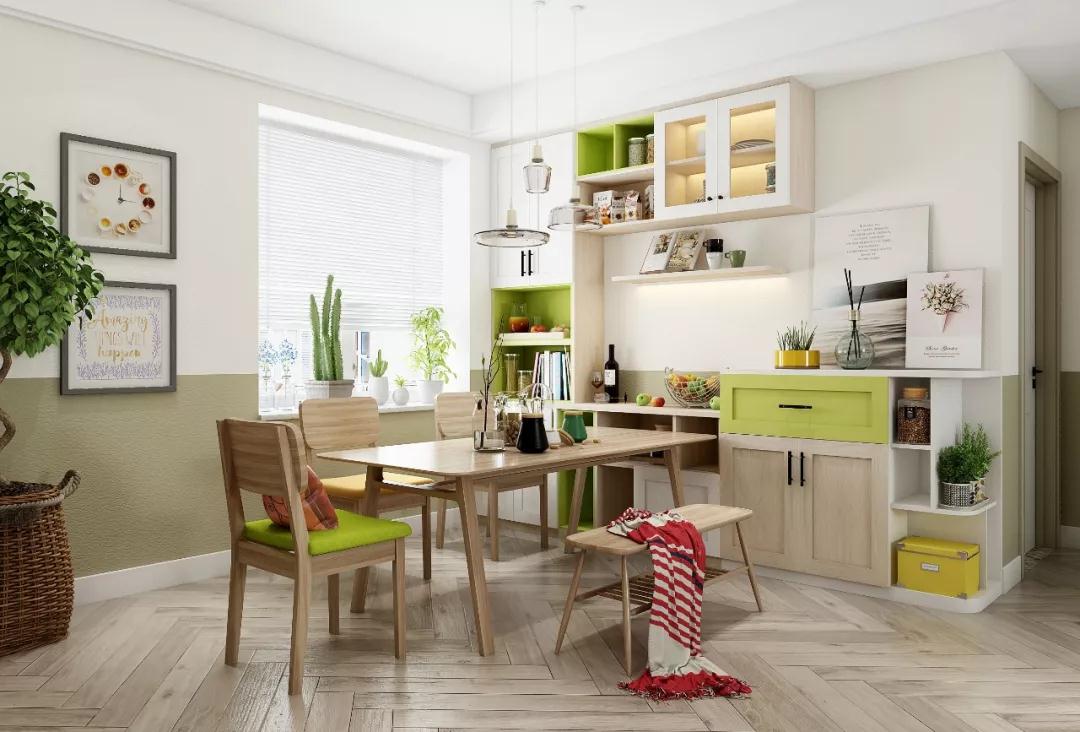 沿墙面的餐边柜设计成组合柜的样式,有适当的留白做展示空间,结合浅色系的原木、白色和清新绿,避免给餐厅空间增加压抑感,小户型可以参考这个做法。
