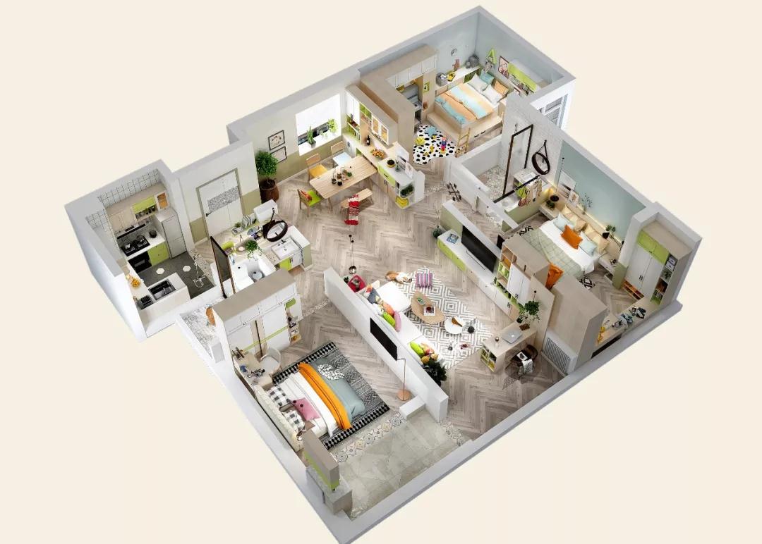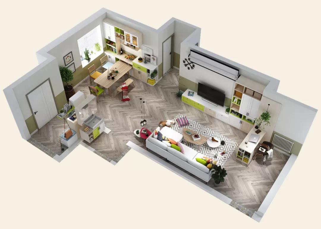 具体方案:三个卧室和客厅用大窗户采光,提升空间开阔感,用清新的淡绿色打造小清新风格的家