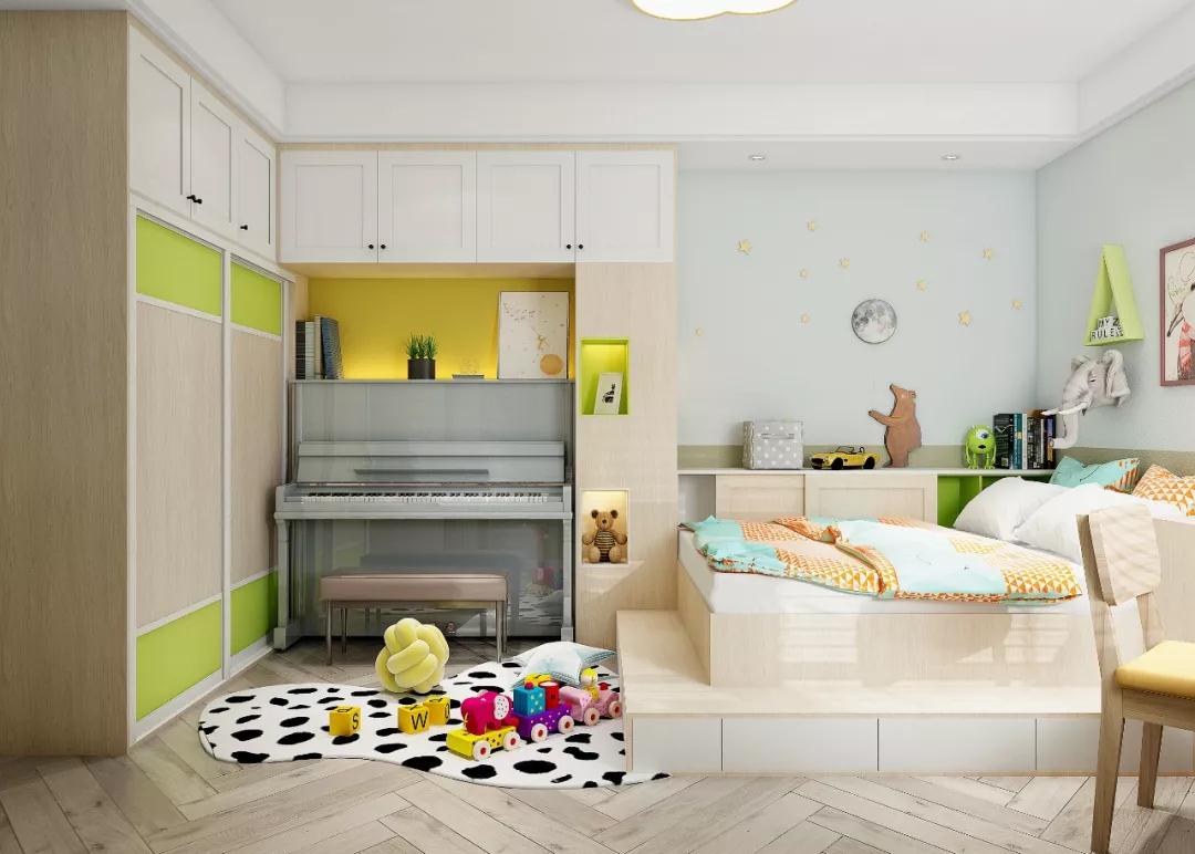 业主的儿子多才又爱玩,儿童房要有开阔的玩乐空间,还要能放下钢琴和书桌。