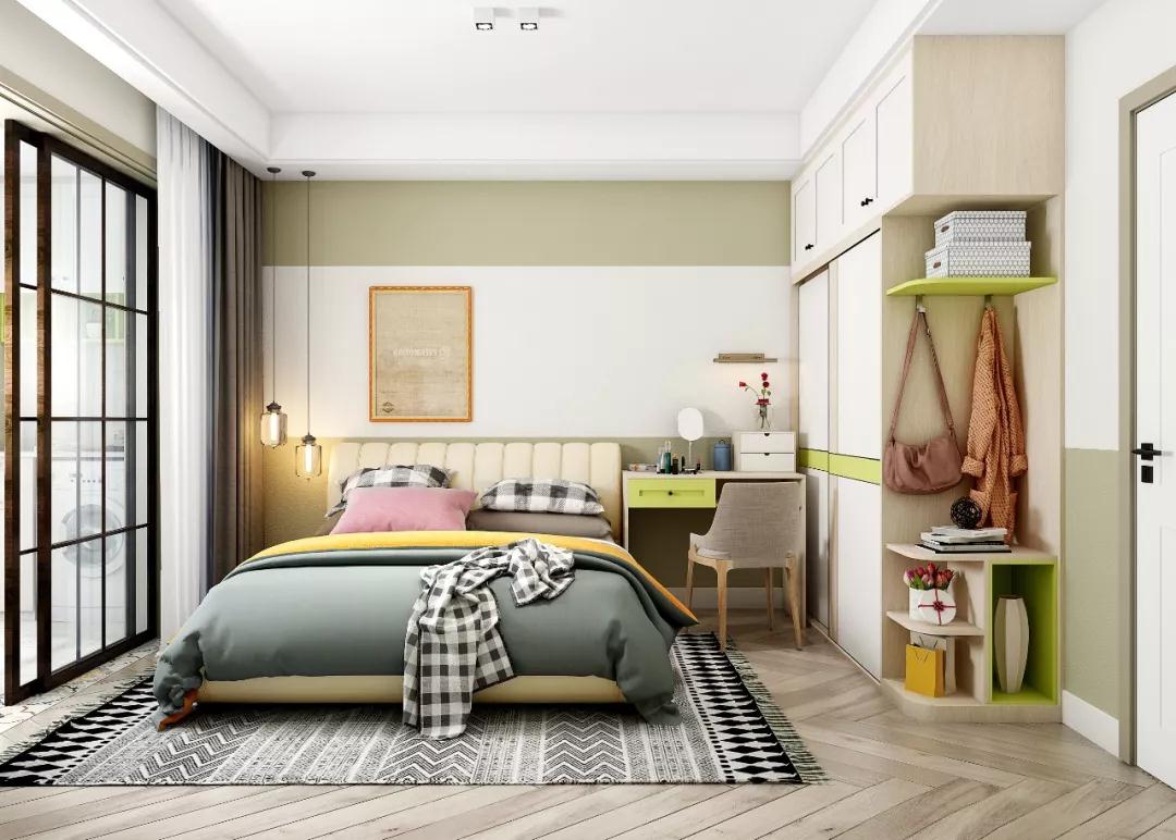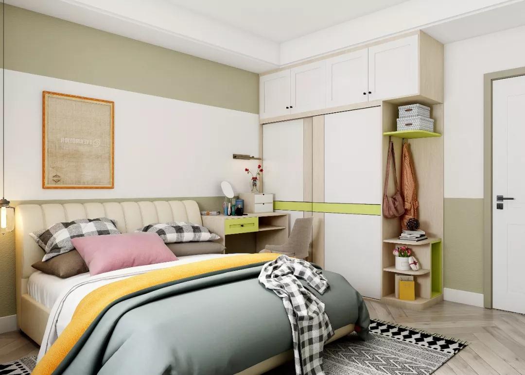 次卧主要是客房,为避免留宿的客人感到局促,除了床和衣柜,还特意加做了一个床头书桌,色调和整个家保持一致,温馨又有点小清新的感觉。