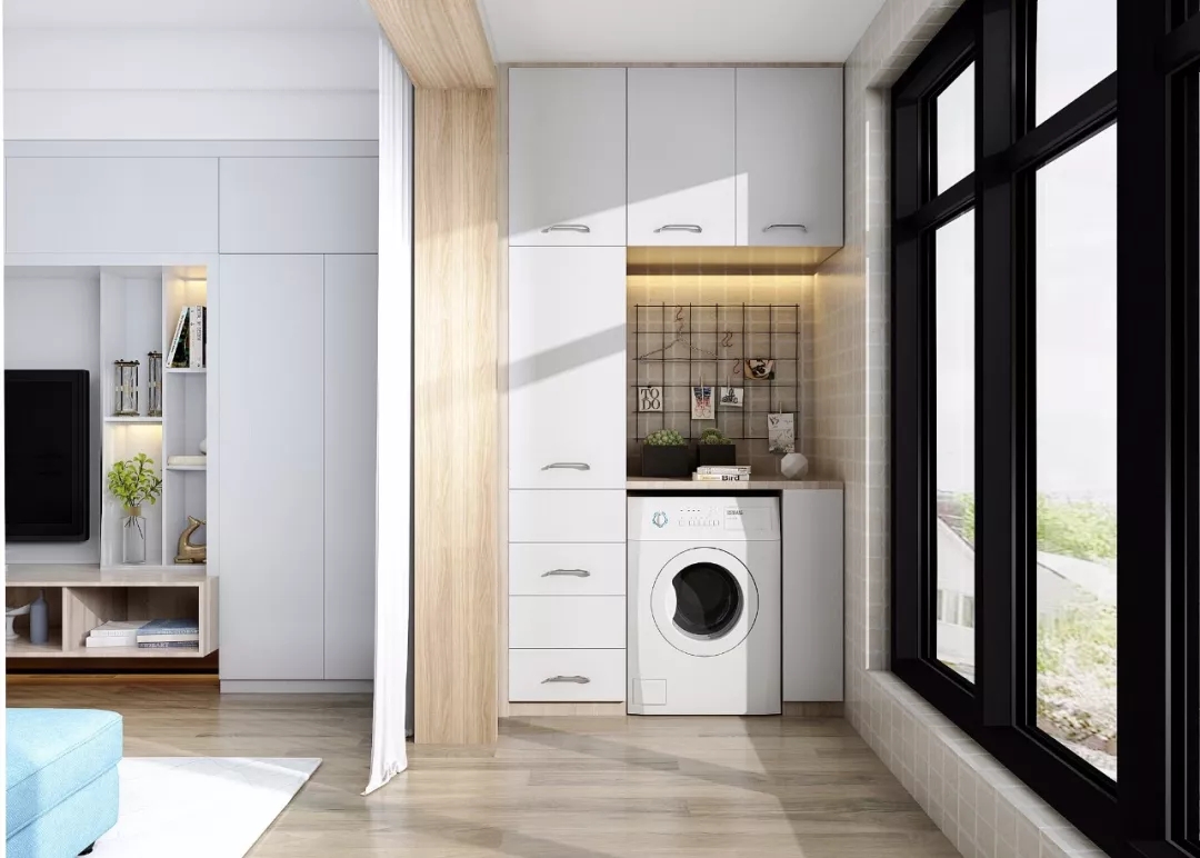 洗衣柜被收纳到阳台里,洗涤区+储物区+休闲区+观景区,四个区域搭配,阳台更加井然有序。闲时,约上三五好友,在阳台上一起开上一盘三国杀,或者用来种种花,陶冶情操。