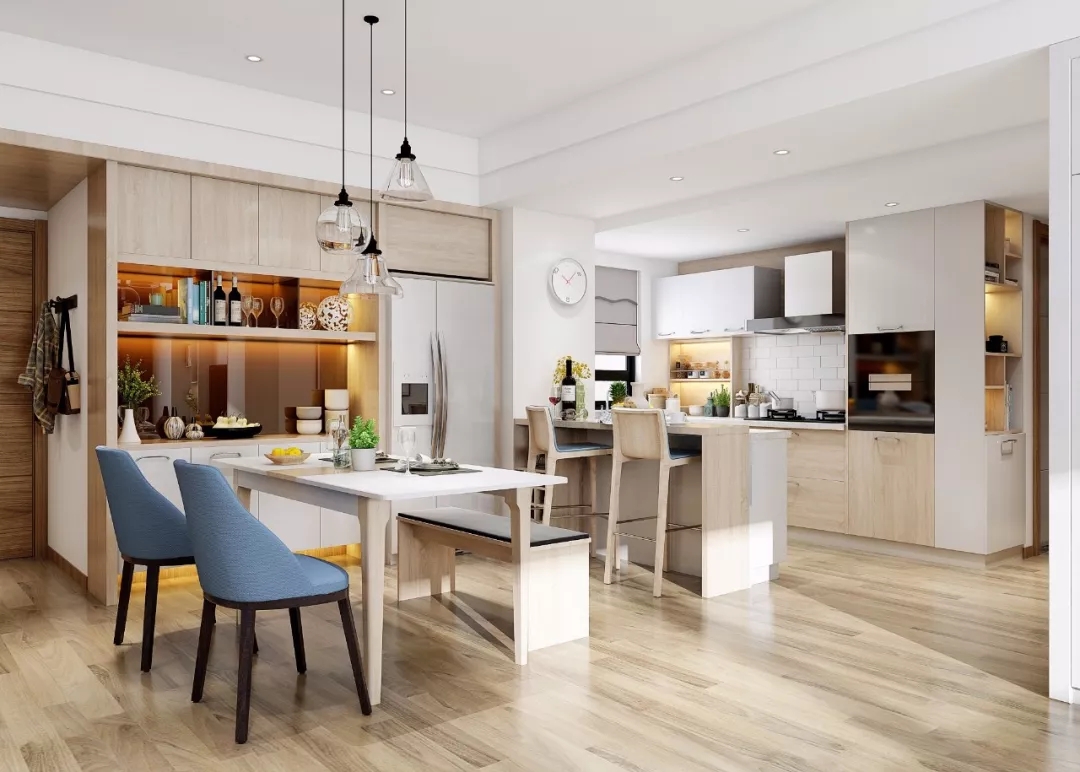 餐厅的一侧是中岛型开放式厨房,厨房的操作台面超宽敞。多出来的操作台,既方便两人同时在厨房做饭,又不拥挤,分工合理其乐融融。