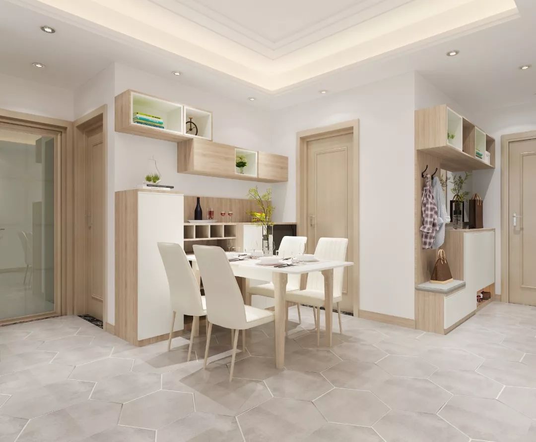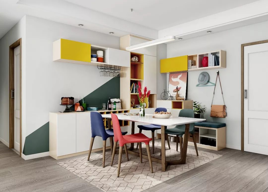▲有些小户型进门就是餐厅,连鞋柜也无处安放,可以把鞋柜和餐边柜结合。柜门上还能花点小心思,橙黄色做点缀,用餐区的跳跃感get!