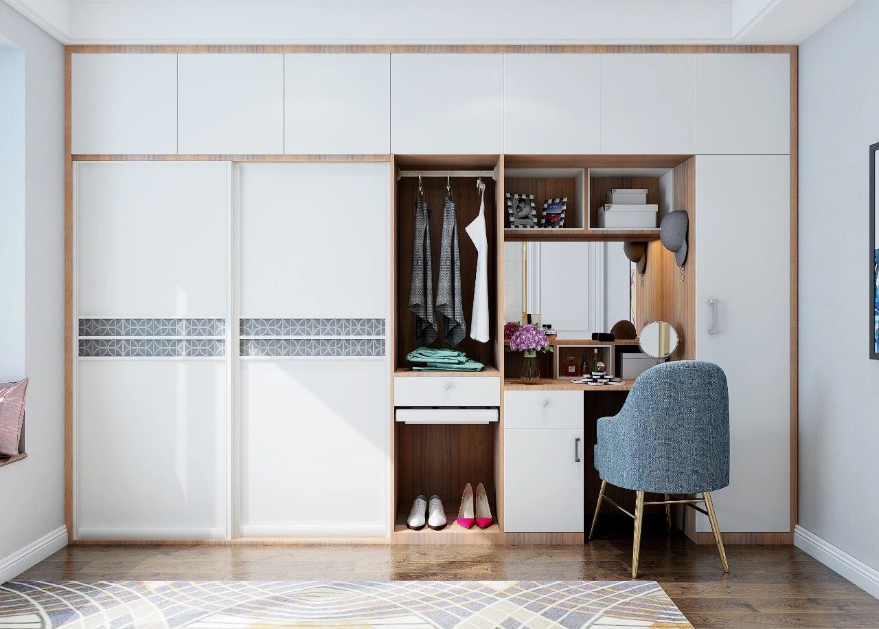 ▲L型衣柜+梳妆台一体化设计,不仅有效利用空间,还能让空间更具整体性。