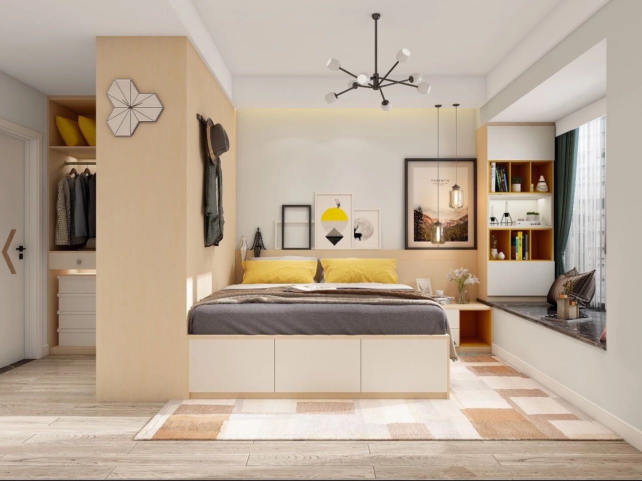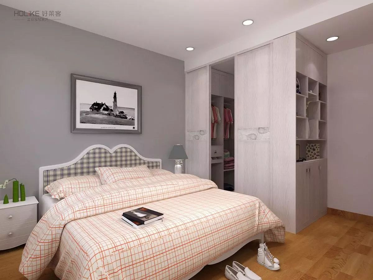 空间规划做好了,卧室里面还能做步入式衣帽间。步入式衣帽间的储存空间完整,衣服陈列整齐,存取方便,有充裕的活动空间。一般配有镜子,以方便试衣,可以用门帘或推拉门做隔断。但面积要保证在4㎡以上。