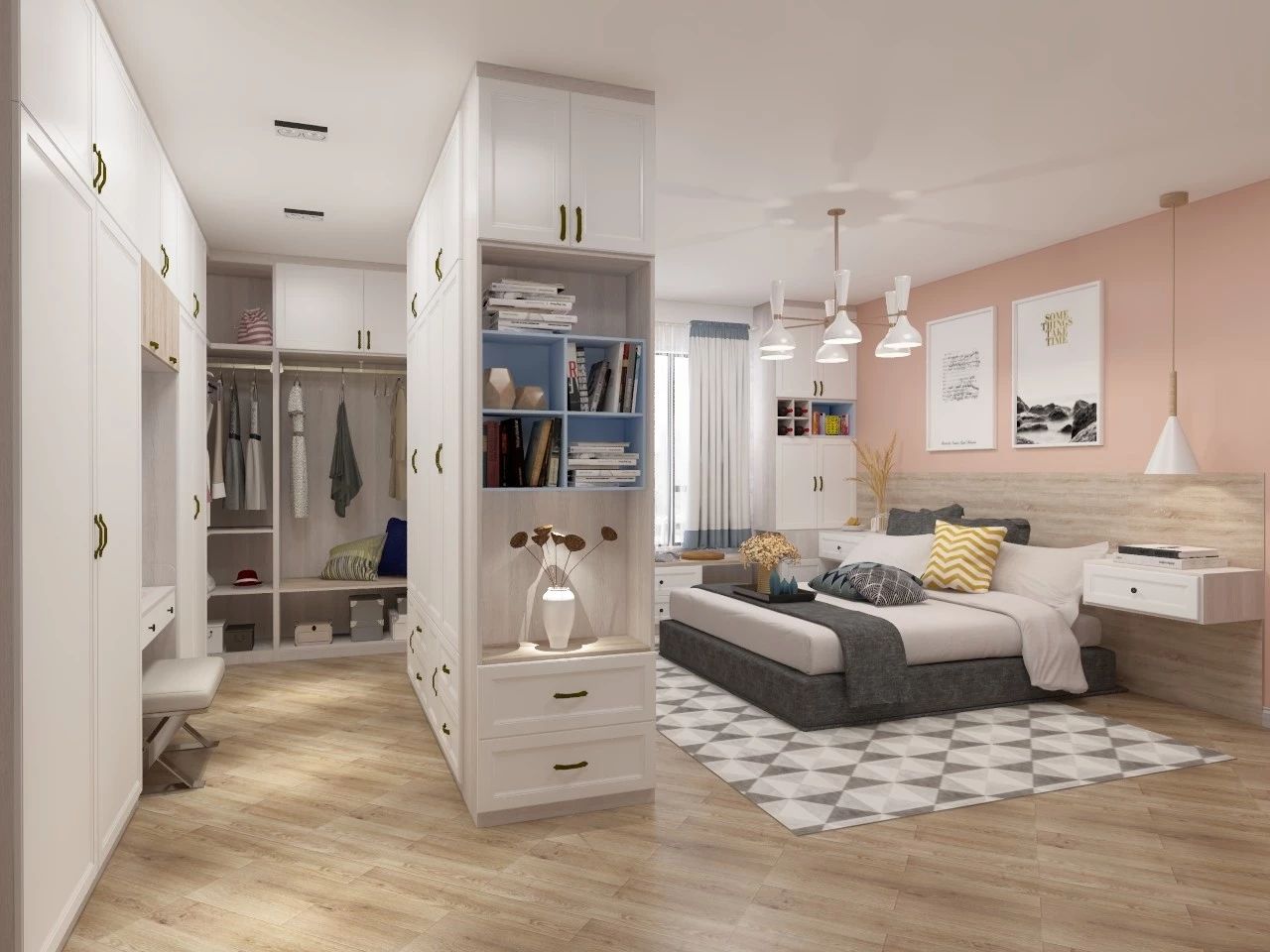没有多余的独立空间,那就把衣帽间放在卧室里。只要利用卧室的一面空墙,就可以打造一个开放式衣帽间。